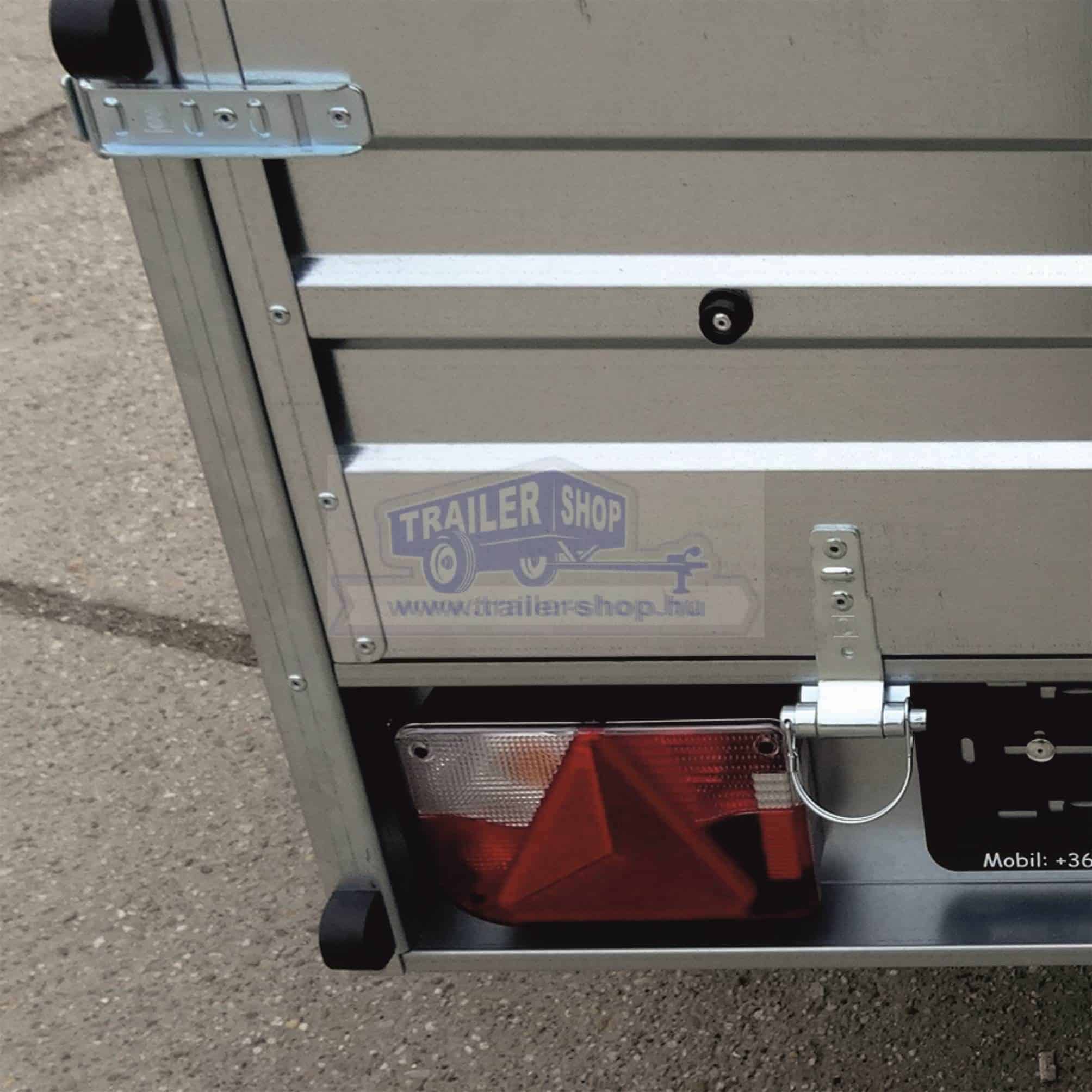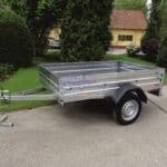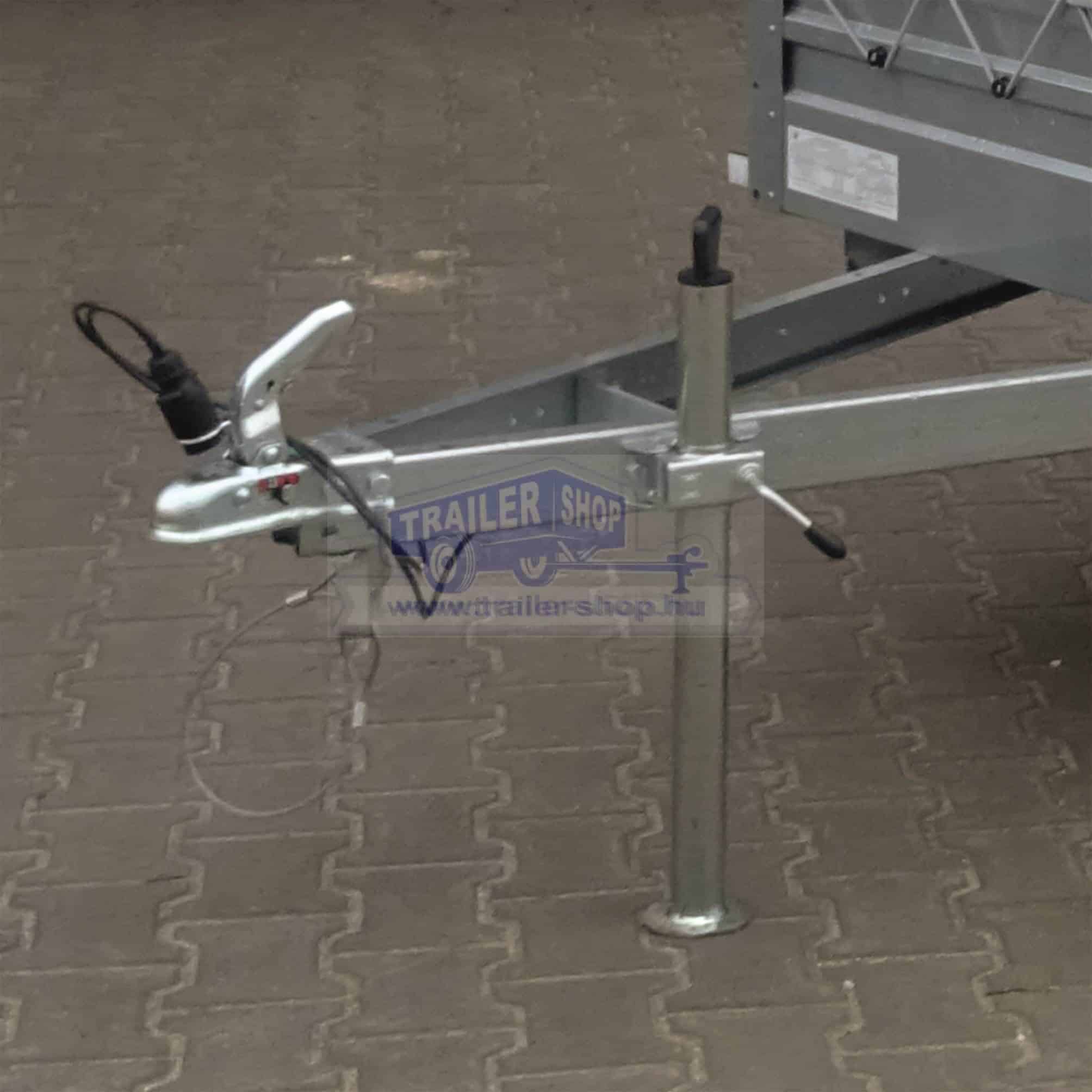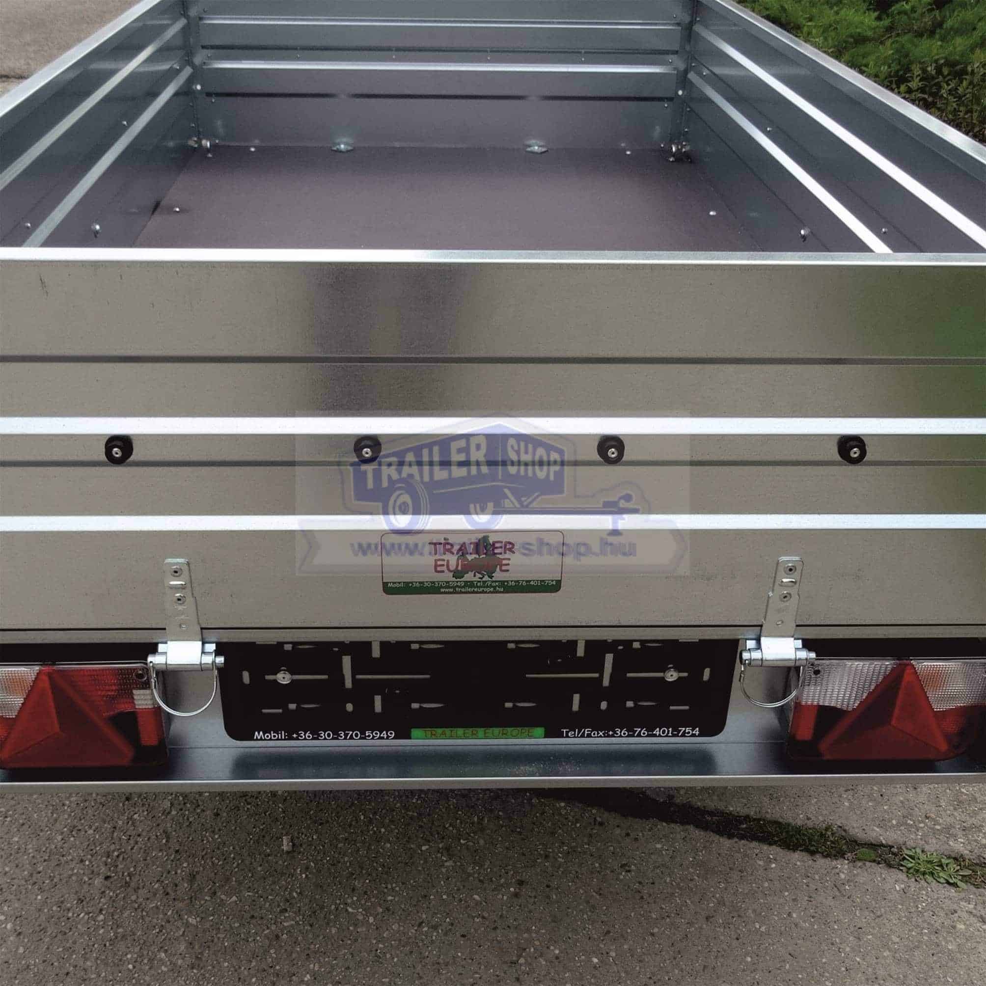 Az utánfutó alvázát megbízható Knott gyártmányú torziós tengely alkotja. A kerékméret 155/70 R13, amely megfelelő stabilitást és terhelhetőséget biztosít. A szállítófelület erős, vízálló és csúszásmentes rétegelt falemez, integrált rögzítő elemekkel így a rakomány mindig biztonságban van. A V-típusú vonórúd biztos vontatási stabilitást nyújt menet közben. Az oldalfalak teljes egészében horganyzott acélból készülnek, bordázott kialakításuknak köszönhetően merev fallal ellenáll a a deformálódásnak. Nyitható hátsó oldala van, ami pár perc alatt lehetővé teszi a be- és kirakodást! Az oldalfalak magassága 35 cm, de kérhető akár 70 cm teljes magasságban is.