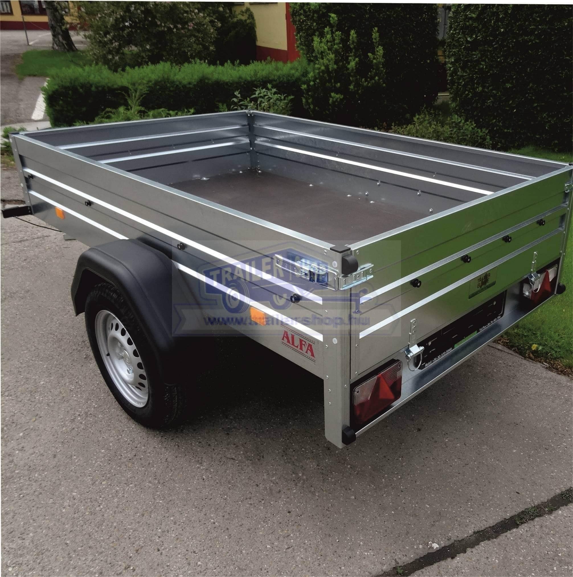 ALFA 11511MN.55 10″ egytengelyes1,45×1,08m méretű, 550kg fékezetlen mellsőkerekes fix oldalfalas nyitott utánfutó 10″ kerékkel