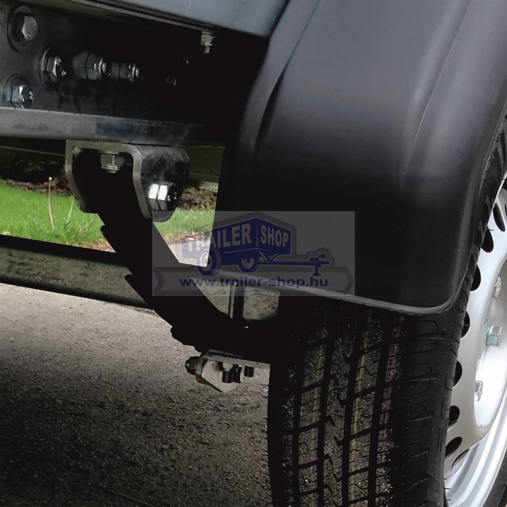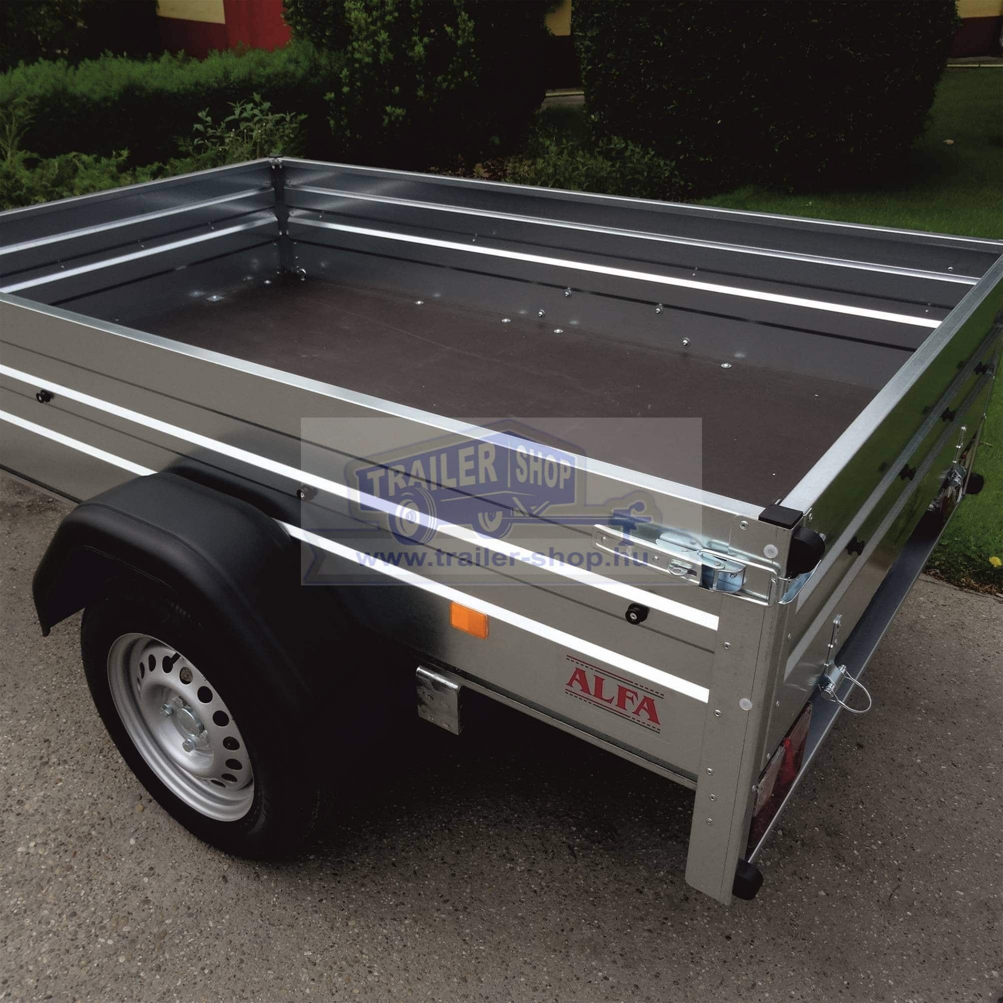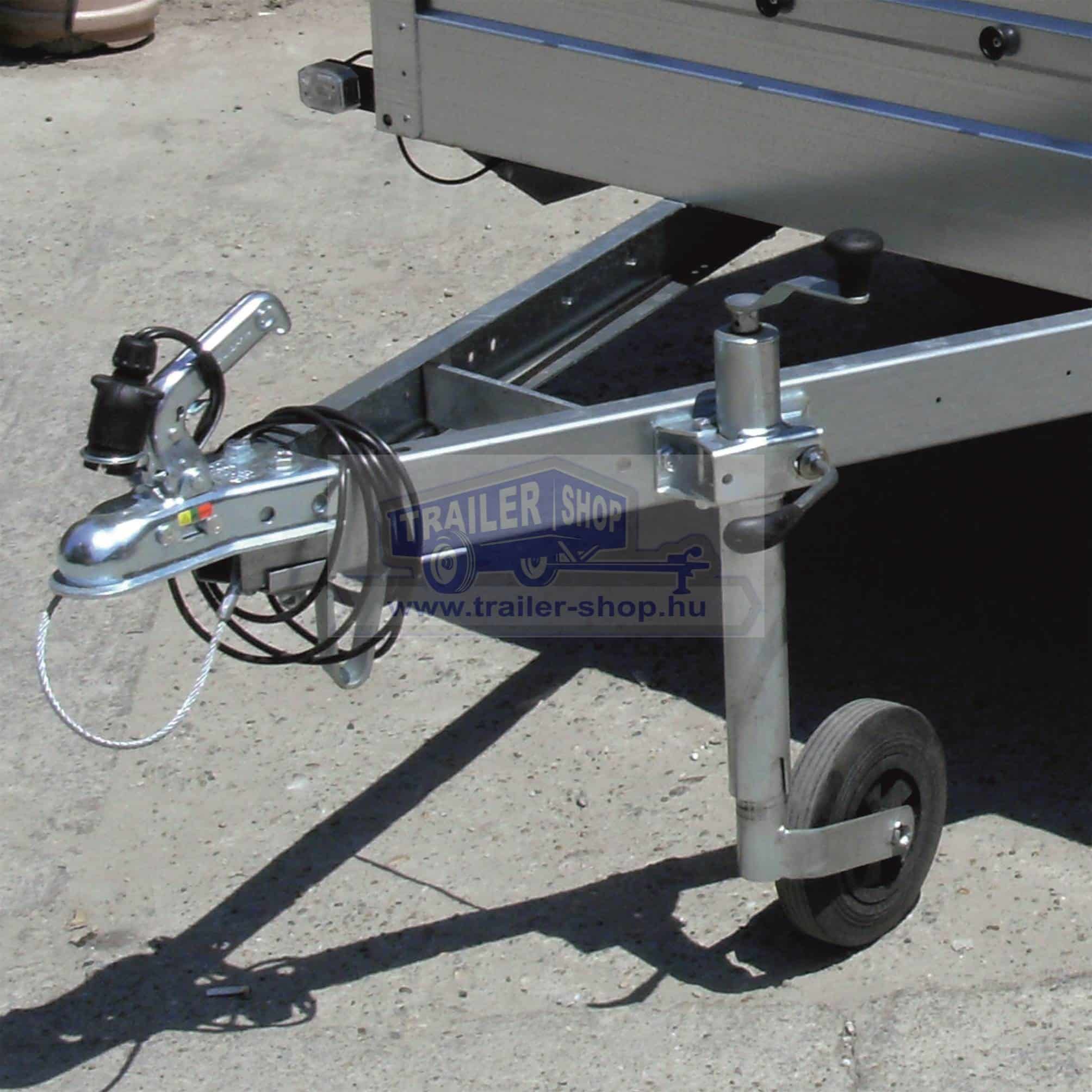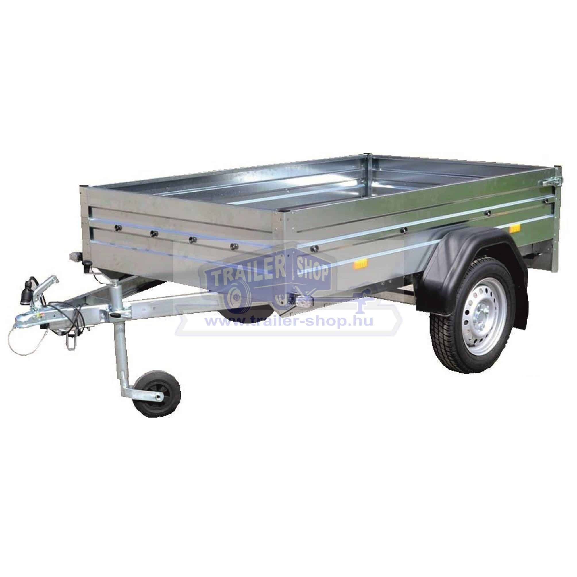 Az utánfutó alvázát megbízható Knott gyártmányú torziós tengely alkotja. A kerékméret 155/70 R13, amely megfelelő stabilitást és terhelhetőséget biztosít. A szállítófelület erős, vízálló és csúszásmentes rétegelt falemez, integrált rögzítő elemekkel így a rakomány mindig biztonságban van. A V-típusú vonórúd biztos vontatási stabilitást nyújt menet közben. Az oldalfalak teljes egészében horganyzott acélból készülnek, bordázott kialakításuknak köszönhetően merev fallal ellenáll a a deformálódásnak. Nyitható hátsó oldala van, ami pár perc alatt lehetővé teszi a be- és kirakodást! Az oldalfalak magassága 35 cm, de kérhető akár 70 cm teljes magasságban is.