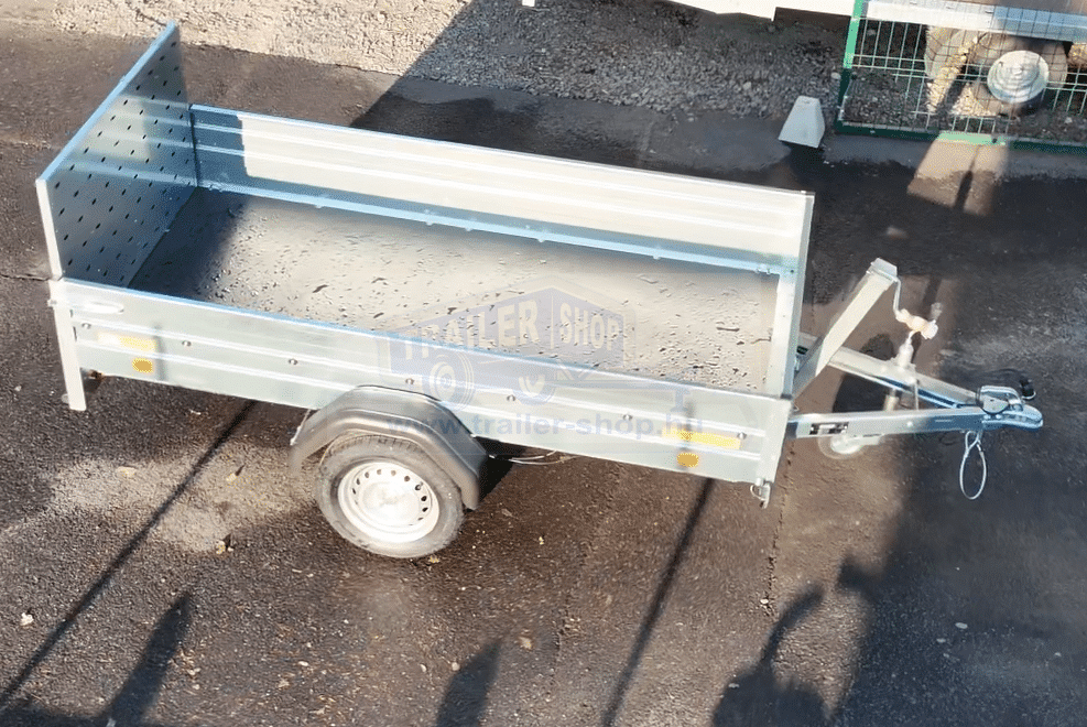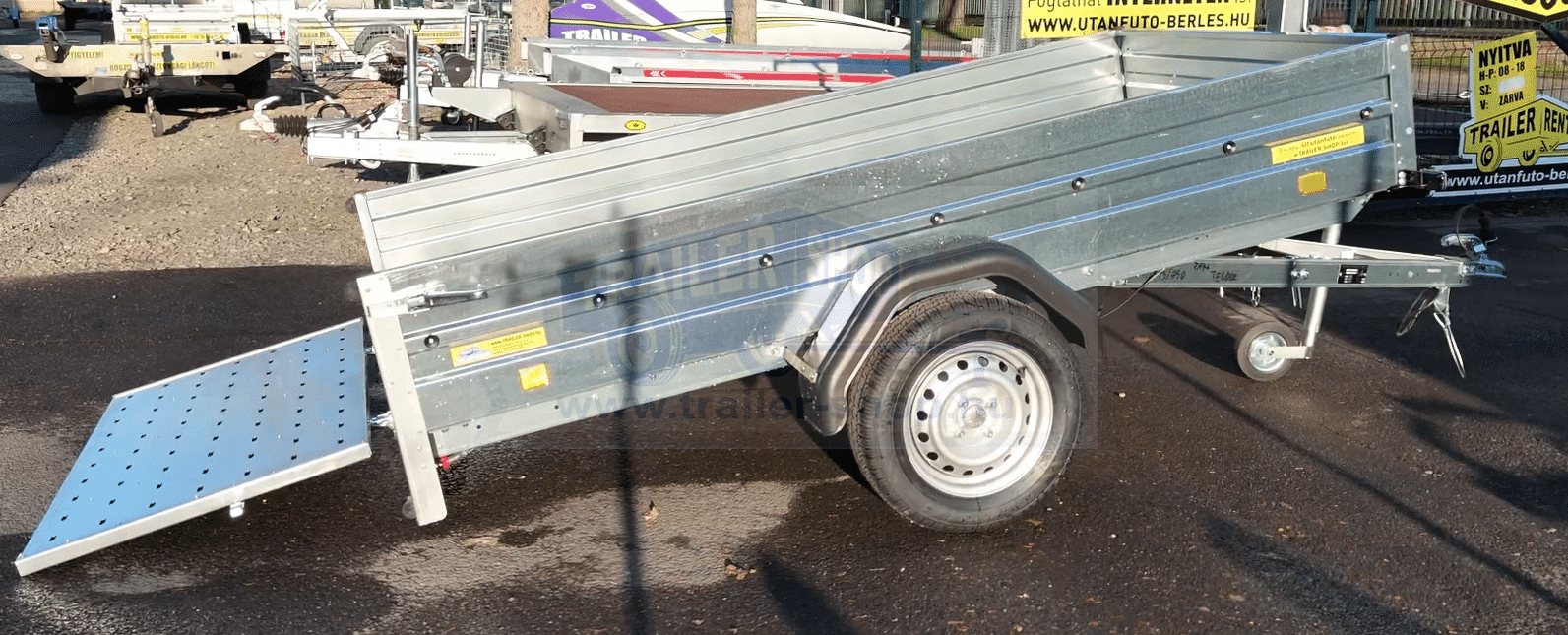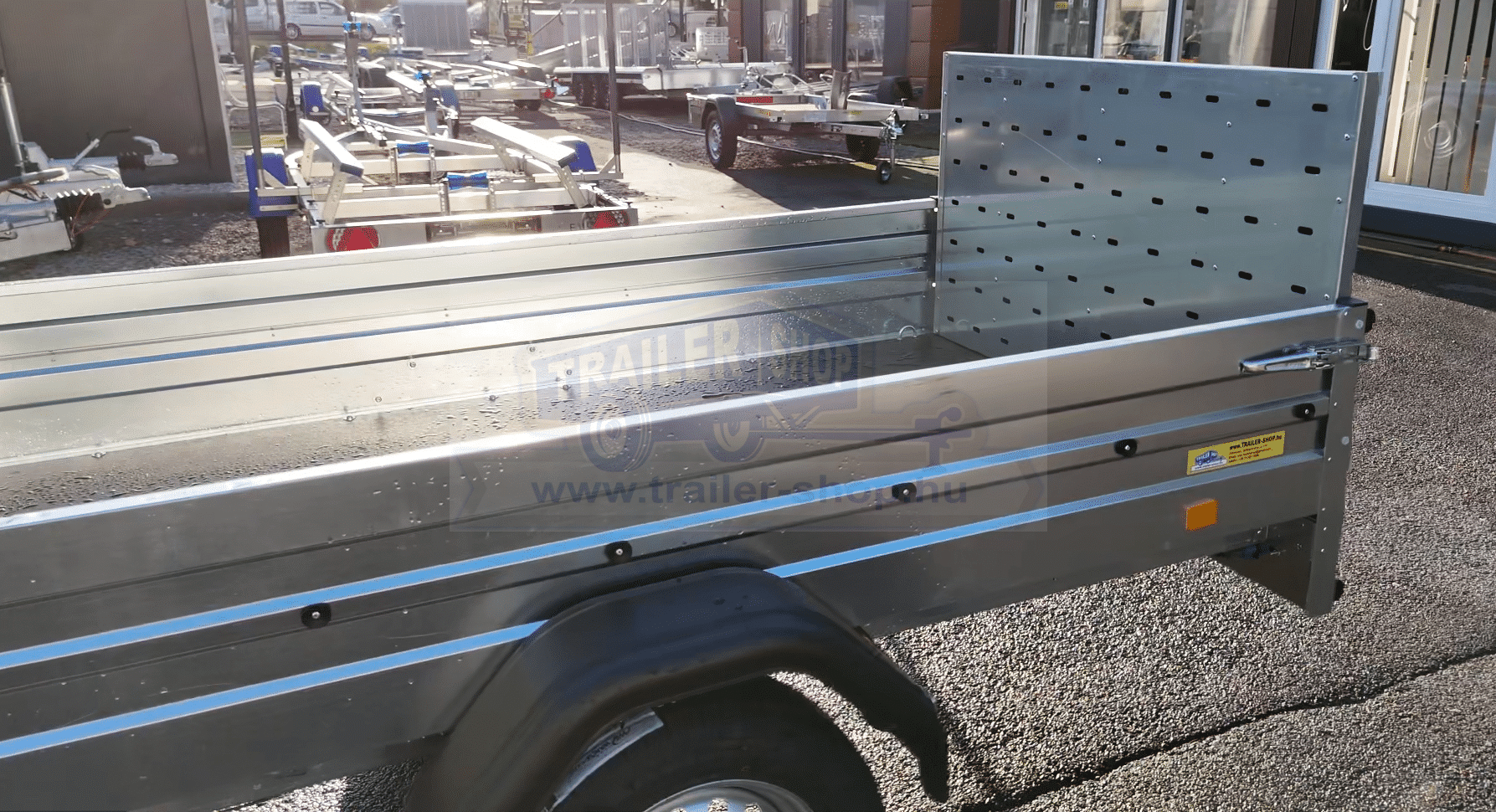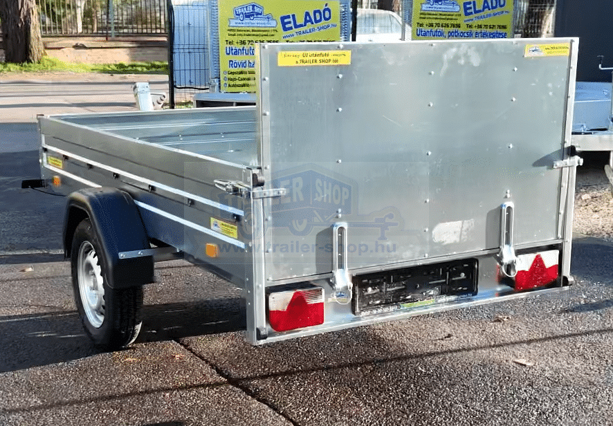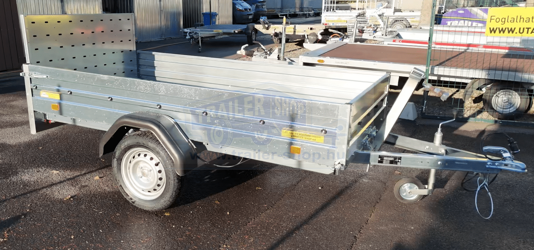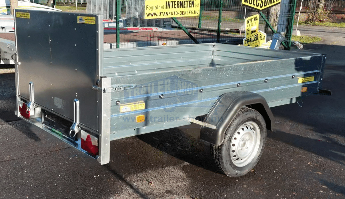 Az utánfutó alvázát megbízható Knott gyártmányú torziós tengely alkotja. A kerékméret 155/70 R13, amely megfelelő stabilitást és terhelhetőséget biztosít. A szállítófelület erős, vízálló és csúszásmentes rétegelt falemez, integrált rögzítő elemekkel így a rakomány mindig biztonságban van. A V-típusú vonórúd biztos vontatási stabilitást nyújt menet közben. Az oldalfalak teljes egészében horganyzott acélból készülnek, bordázott kialakításuknak köszönhetően merev fallal ellenáll a a deformálódásnak. Nyitható hátsó oldala van, ami pár perc alatt lehetővé teszi a be- és kirakodást! Az oldalfalak magassága 35 cm, de kérhető akár 70 cm teljes magasságban is.