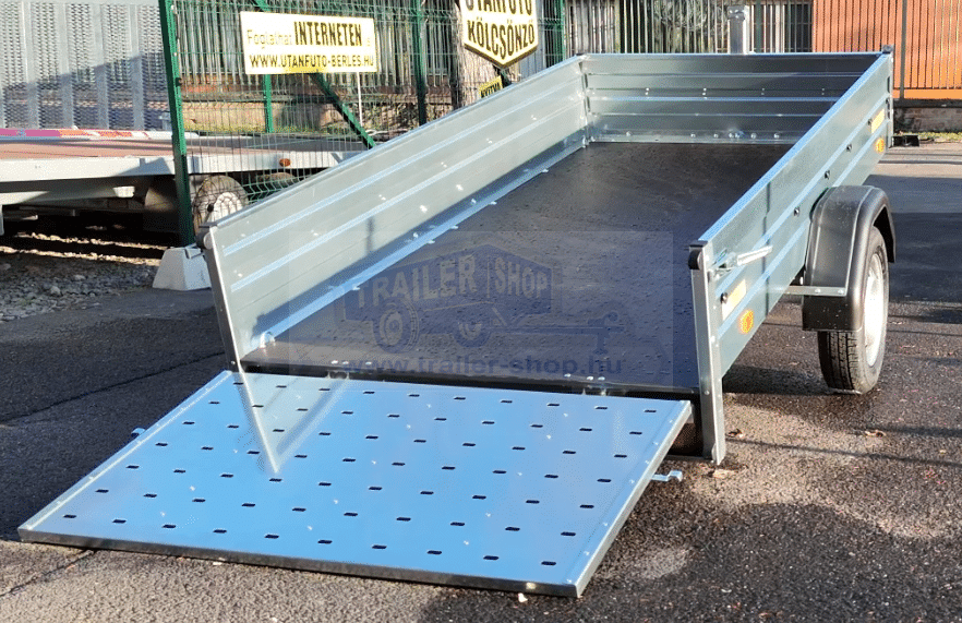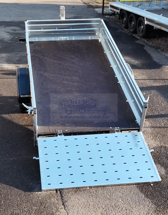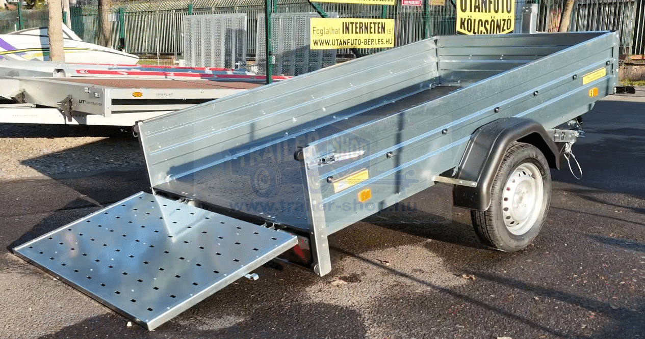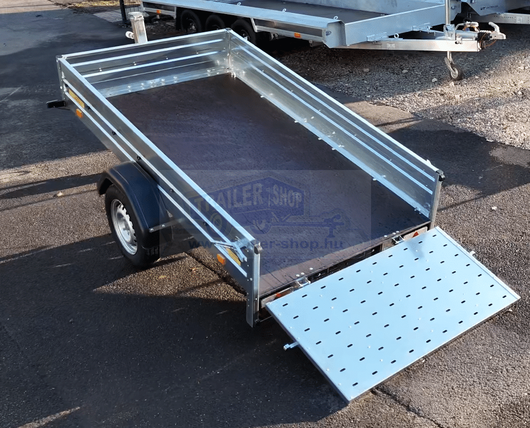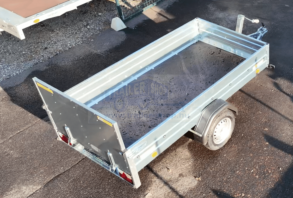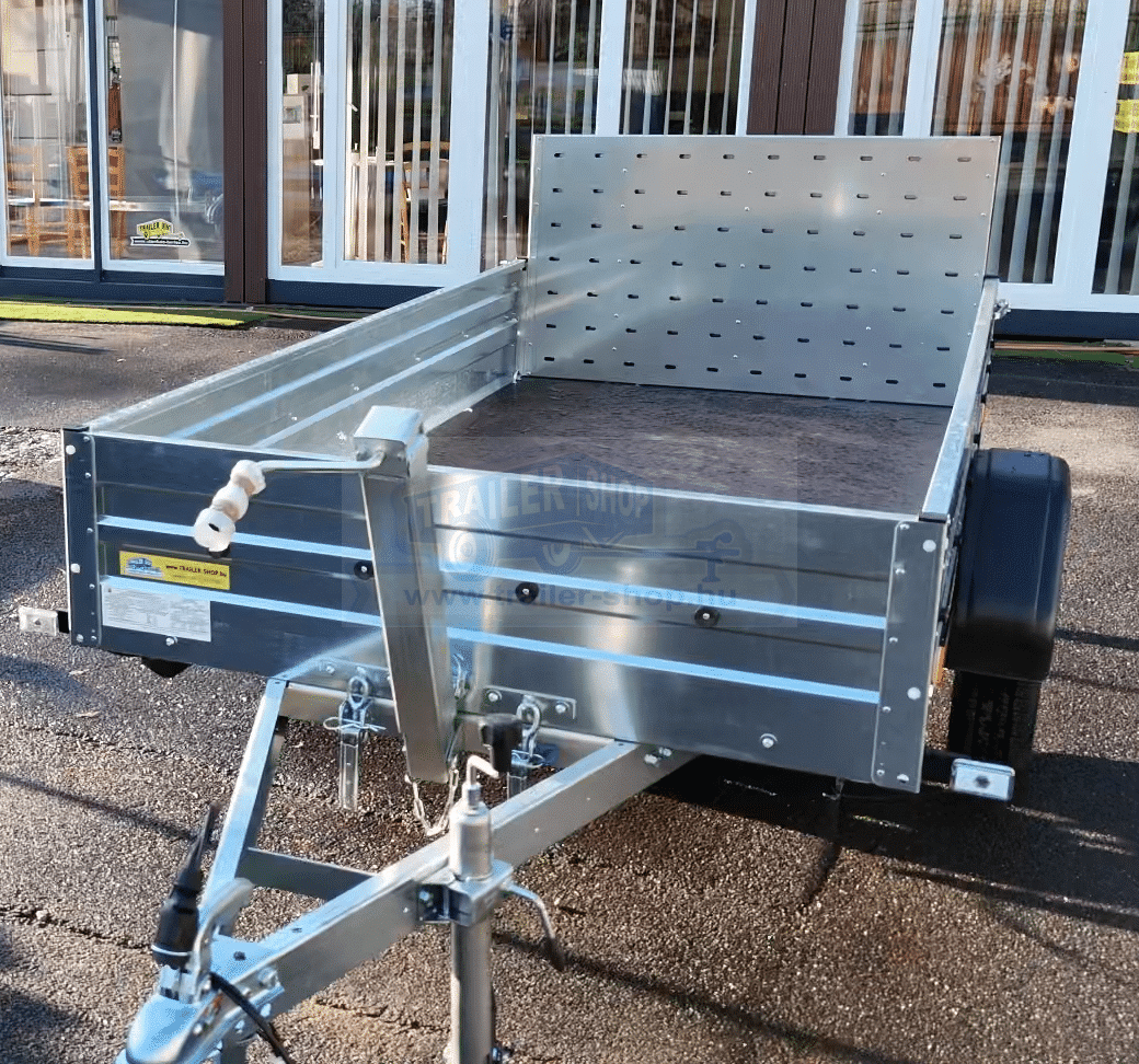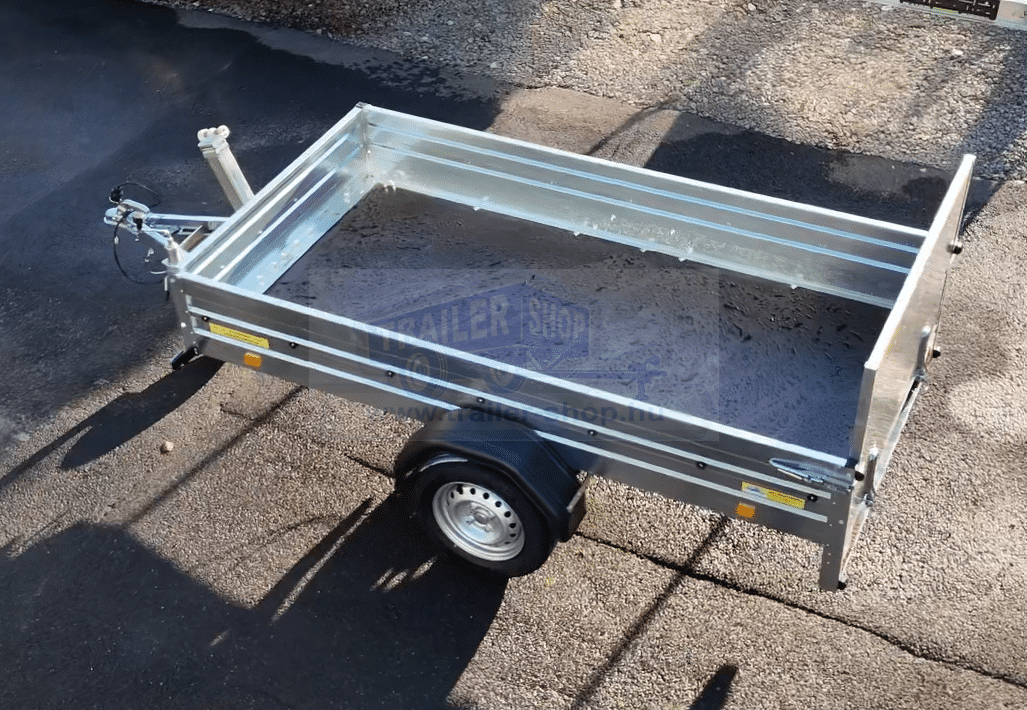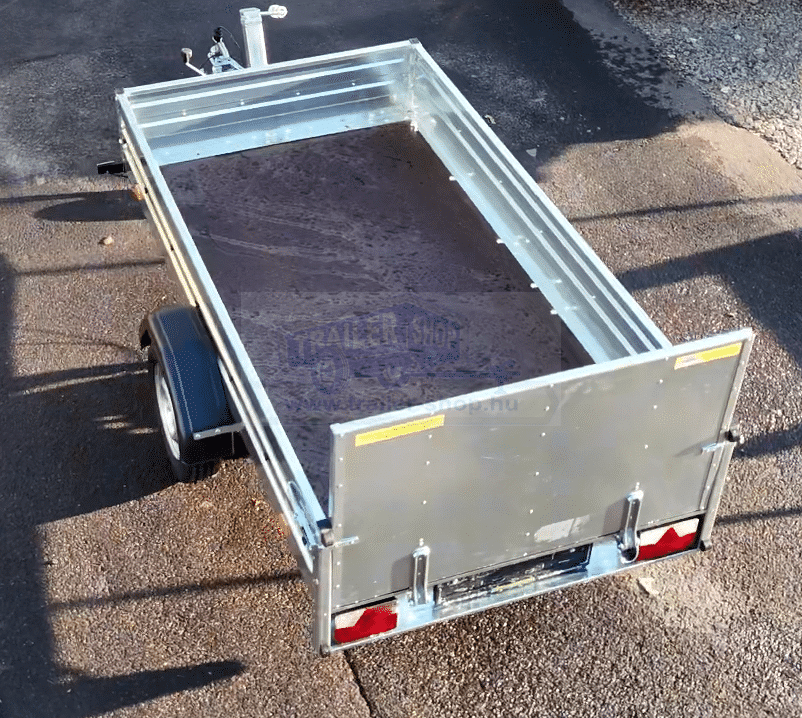 Az utánfutó alvázát megbízható Knott gyártmányú torziós tengely alkotja. A kerékméret 155/70 R13, amely megfelelő stabilitást és terhelhetőséget biztosít. A szállítófelület erős, vízálló és csúszásmentes rétegelt falemez, integrált rögzítő elemekkel így a rakomány mindig biztonságban van. A V-típusú vonórúd biztos vontatási stabilitást nyújt menet közben. Az oldalfalak teljes egészében horganyzott acélból készülnek, bordázott kialakításuknak köszönhetően merev fallal ellenáll a a deformálódásnak. Nyitható hátsó oldala van, ami pár perc alatt lehetővé teszi a be- és kirakodást! Az oldalfalak magassága 35 cm, de kérhető akár 70 cm teljes magasságban is.