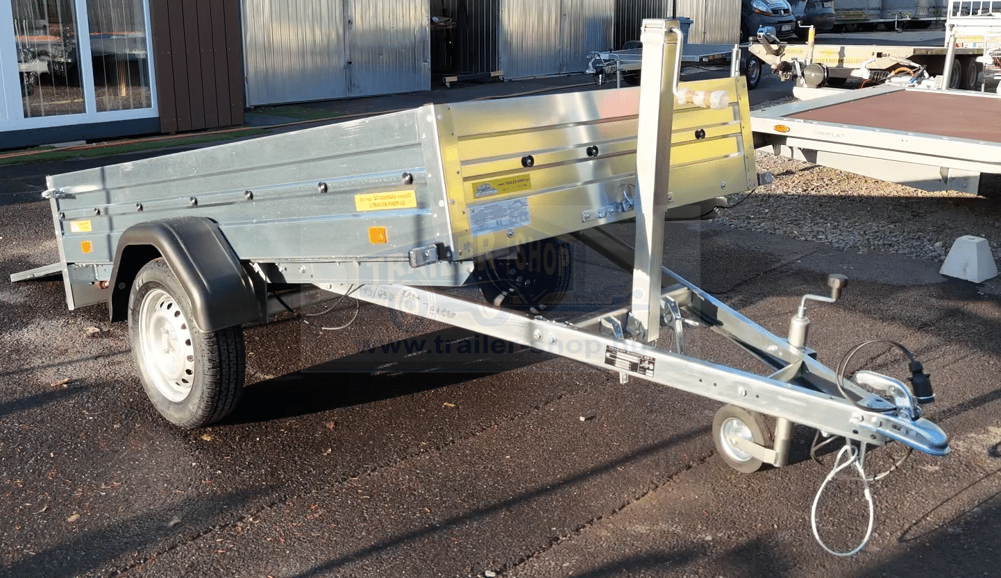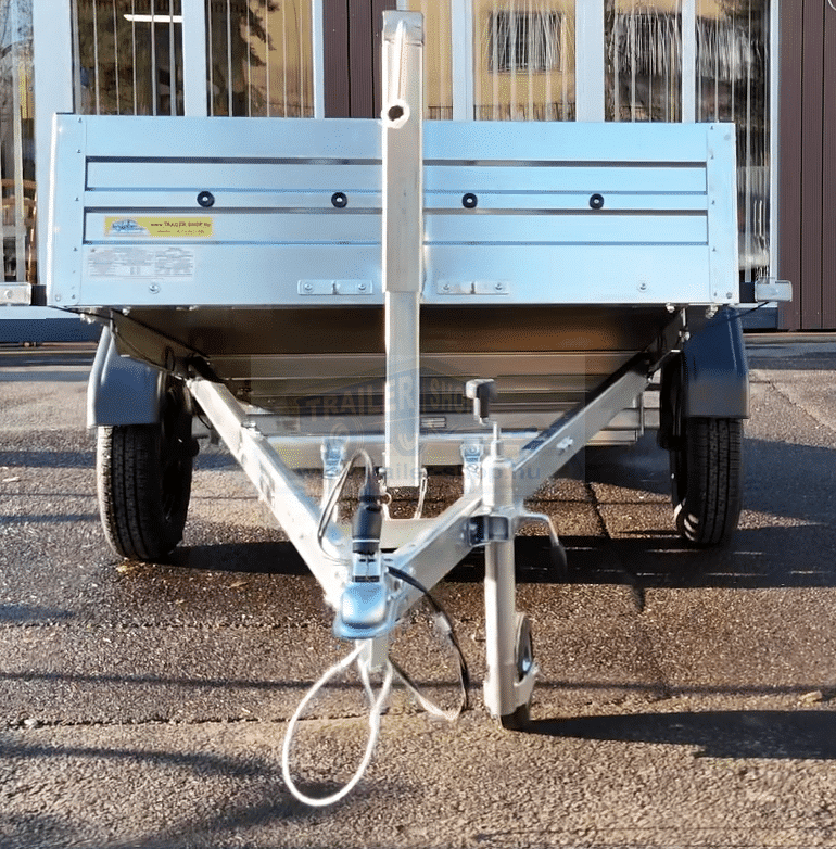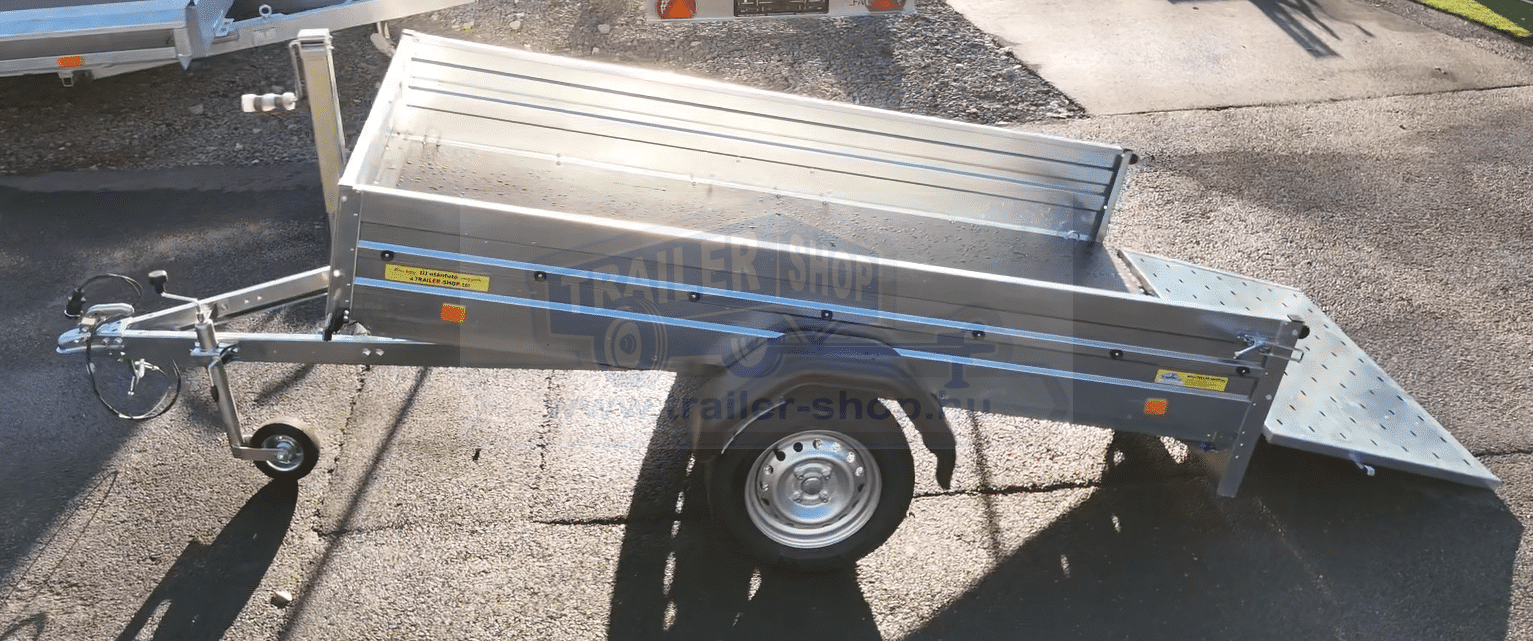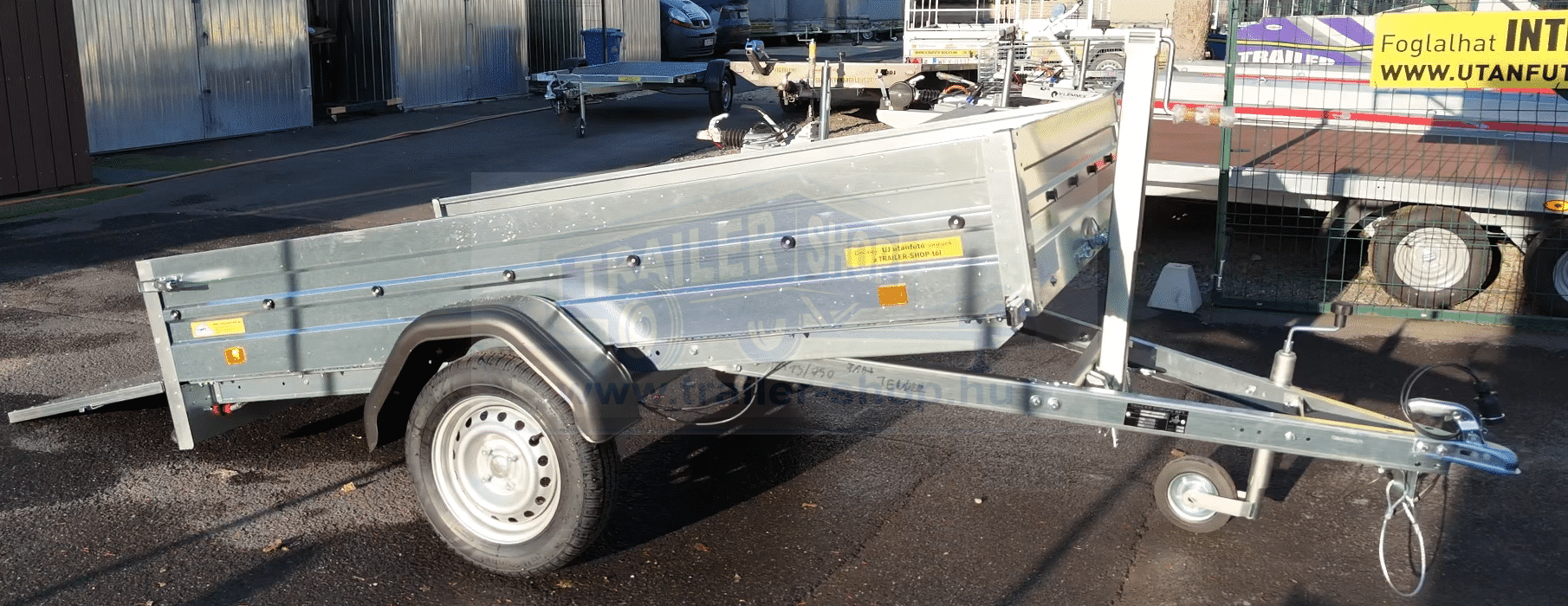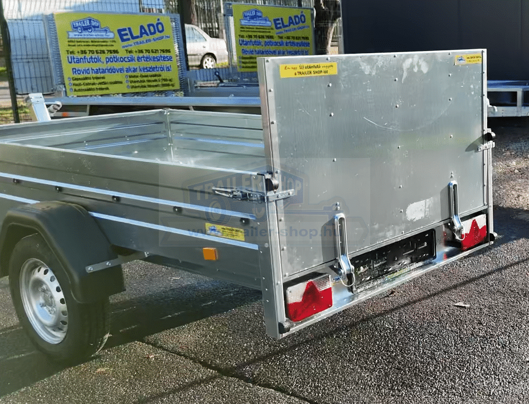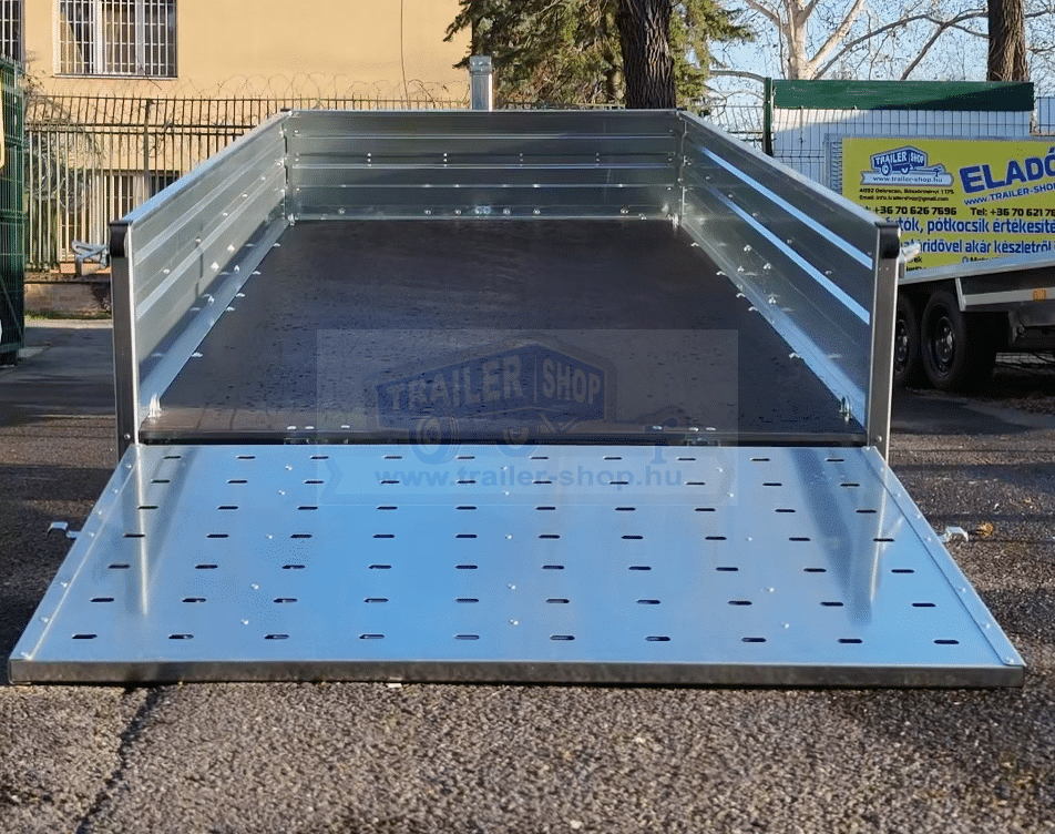 Az utánfutó alvázát megbízható Knott gyártmányú torziós tengely alkotja. A kerékméret 155/70 R13, amely megfelelő stabilitást és terhelhetőséget biztosít. A szállítófelület erős, vízálló és csúszásmentes rétegelt falemez, integrált rögzítő elemekkel így a rakomány mindig biztonságban van. A V-típusú vonórúd biztos vontatási stabilitást nyújt menet közben. Az oldalfalak teljes egészében horganyzott acélból készülnek, bordázott kialakításuknak köszönhetően merev fallal ellenáll a a deformálódásnak. Nyitható hátsó oldala van, ami pár perc alatt lehetővé teszi a be- és kirakodást! Az oldalfalak magassága 35 cm, de kérhető akár 70 cm teljes magasságban is.