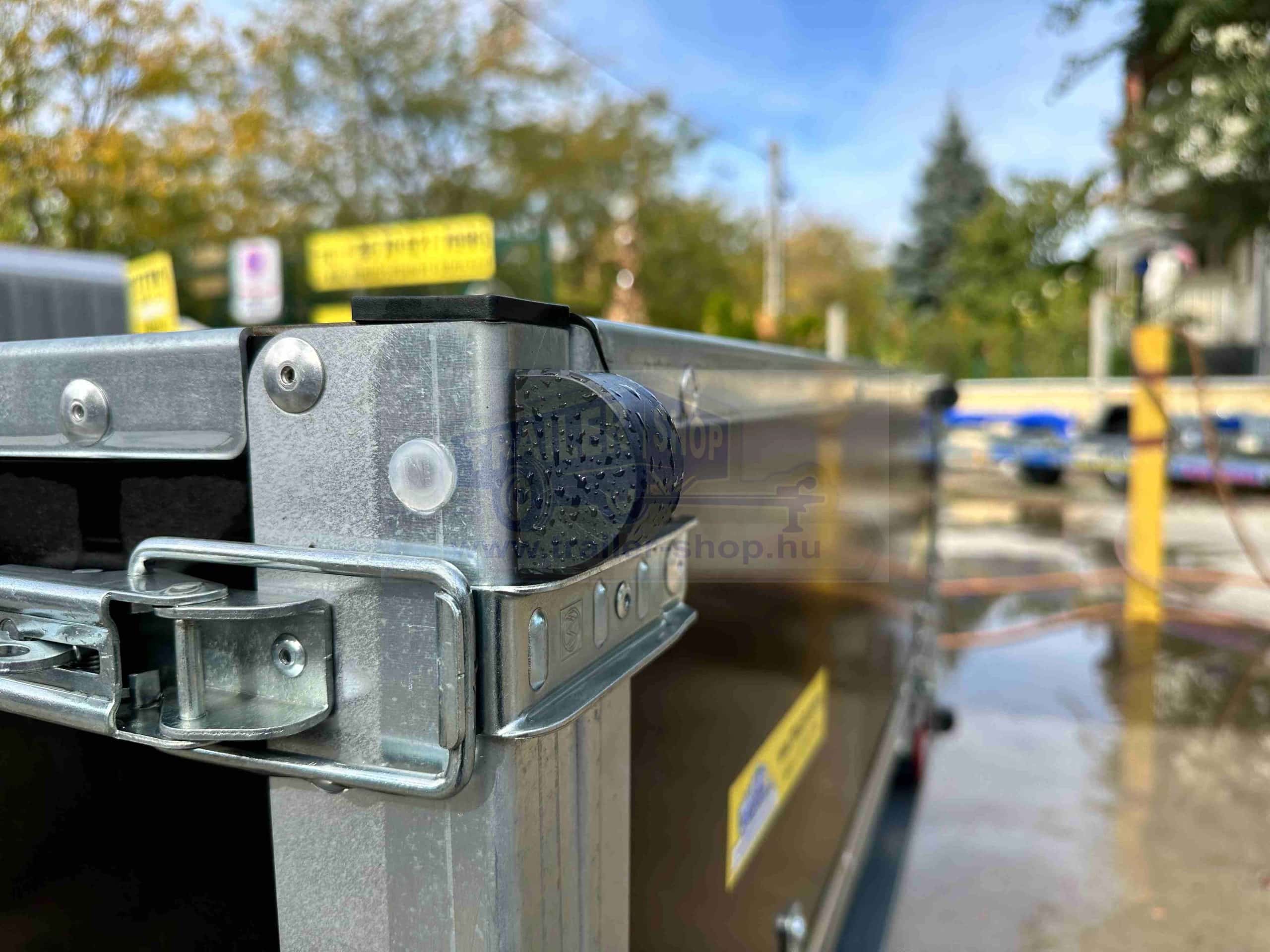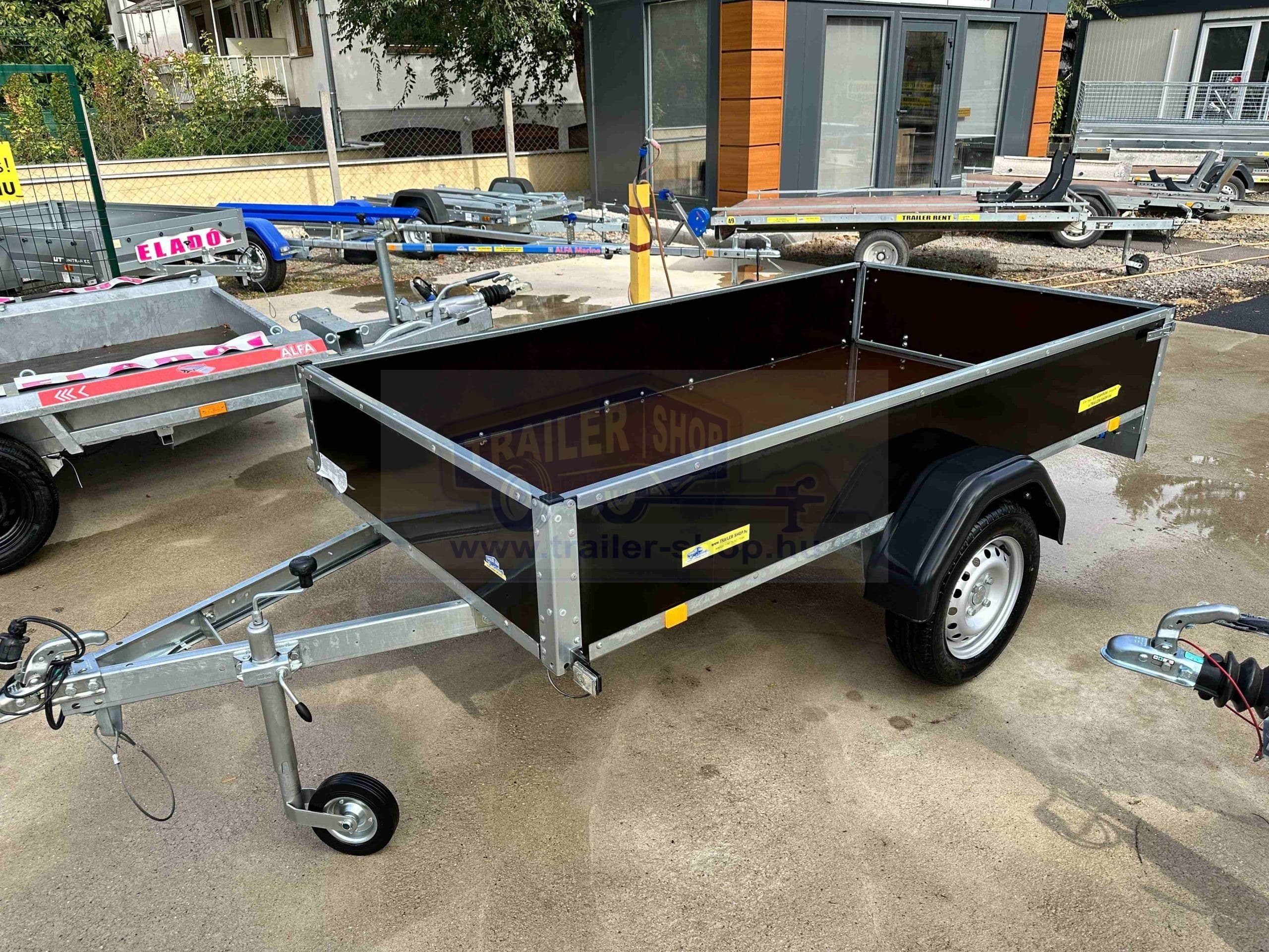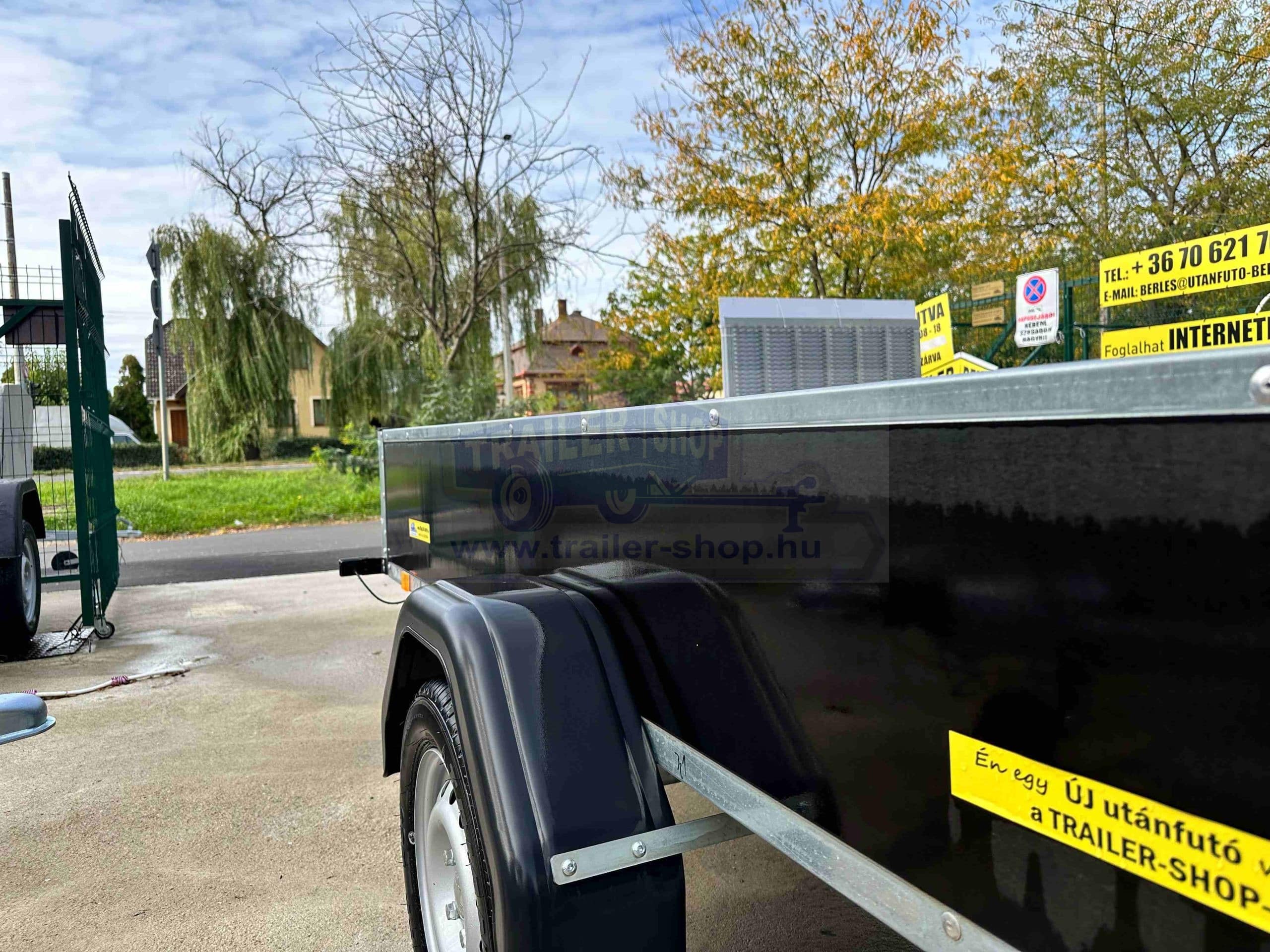 Az utánfutó alvázát megbízható Knott gyártmányú torziós tengely alkotja. A kerékméret 155/70 R13, amely megfelelő stabilitást és terhelhetőséget biztosít. A szállítófelület erős, vízálló és csúszásmentes rétegelt falemez, integrált rögzítő elemekkel így a rakomány mindig biztonságban van. A V-típusú vonórúd biztos vontatási stabilitást nyújt menet közben. Az oldalfalak teljes egészében horganyzott acélból készülnek, bordázott kialakításuknak köszönhetően merev fallal ellenáll a a deformálódásnak. Nyitható hátsó oldala van, ami pár perc alatt lehetővé teszi a be- és kirakodást! Az oldalfalak magassága 35 cm, de kérhető akár 70 cm teljes magasságban is.