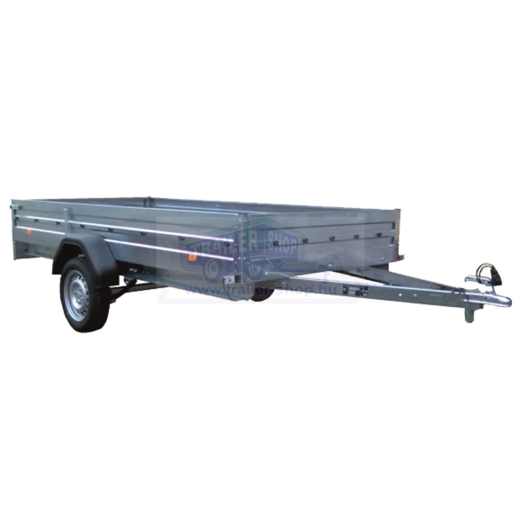 Az utánfutó alvázát megbízható Knott gyártmányú torziós tengely alkotja. A kerékméret 155/70 R13, amely megfelelő stabilitást és terhelhetőséget biztosít. A szállítófelület erős, vízálló és csúszásmentes rétegelt falemez, integrált rögzítő elemekkel így a rakomány mindig biztonságban van. A V-típusú vonórúd biztos vontatási stabilitást nyújt menet közben. Az oldalfalak teljes egészében horganyzott acélból készülnek, bordázott kialakításuknak köszönhetően merev fallal ellenáll a a deformálódásnak. Nyitható hátsó oldala van, ami pár perc alatt lehetővé teszi a be- és kirakodást!  Az oldalfalak magassága 35 cm, de kérhető  akár 70 cm teljes magasságban is.