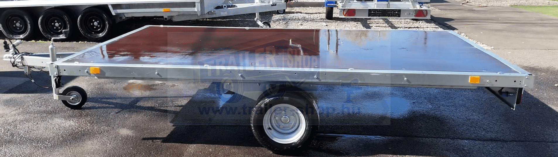 A síkplatós utánfutó ideális választás minden olyan feladathoz, ahol a rakomány mérete, alakja vagy hossza miatt zárt oldalfal nélküli szállítás szükséges. Nyitott kialakítása maximális rakodási szabadságot kínál – egyszerűen és gyorsan elhelyezhető rajta építőanyag, gép, raklapos áru vagy akár hosszú fém- és faelemek is. Erős, horganyzott acélszerkezete ellenáll az időjárásnak és a mechanikai igénybevételnek, így kültéri használatra is kiváló. A csúszásmentes padló biztos tapadást nyújt, míg a megerősített alváz gondoskodik a teherbírásról és stabilitásról. A síkplatós kivitel különösen népszerű a kivitelezők, kertépítők, gazdálkodók és magánszemélyek körében, akik megbízható, könnyen kezelhető és sokoldalúan használható utánfutót keresnek a mindennapi szállítási feladatokra.