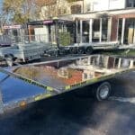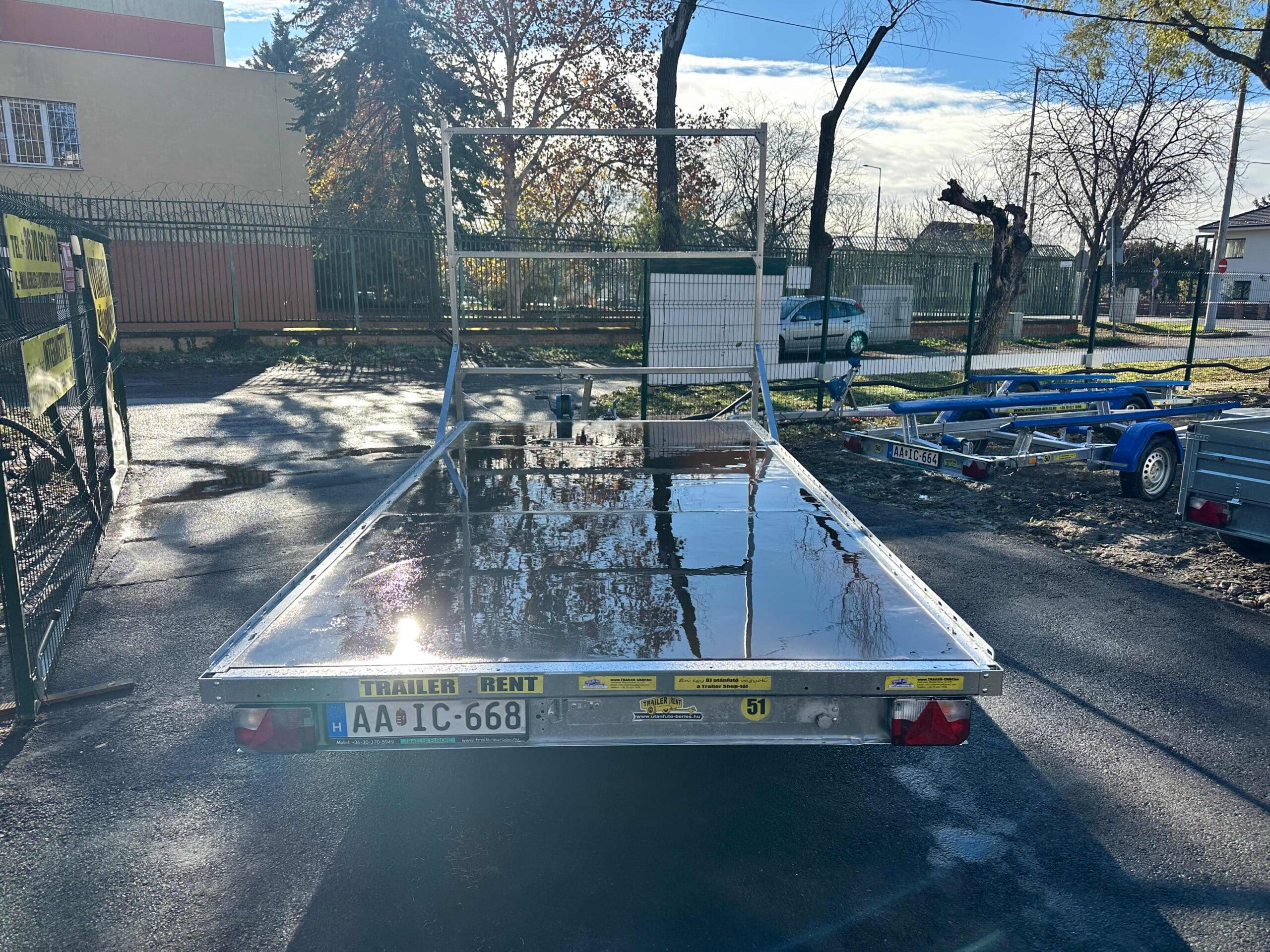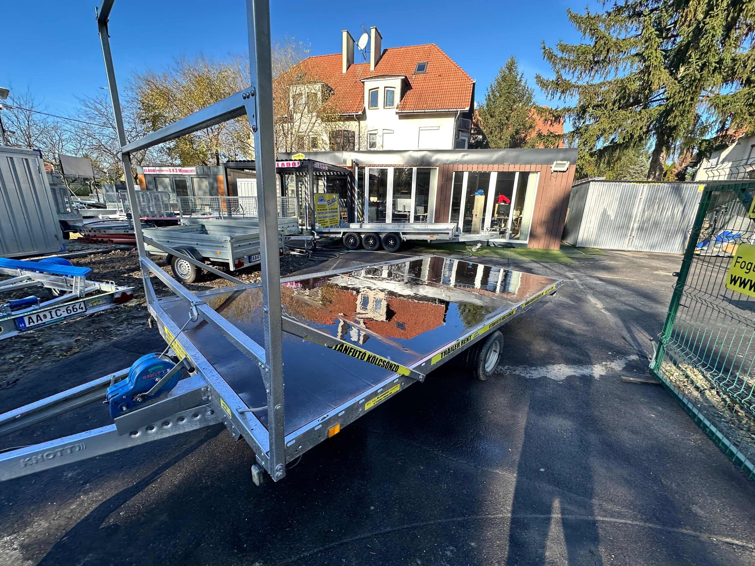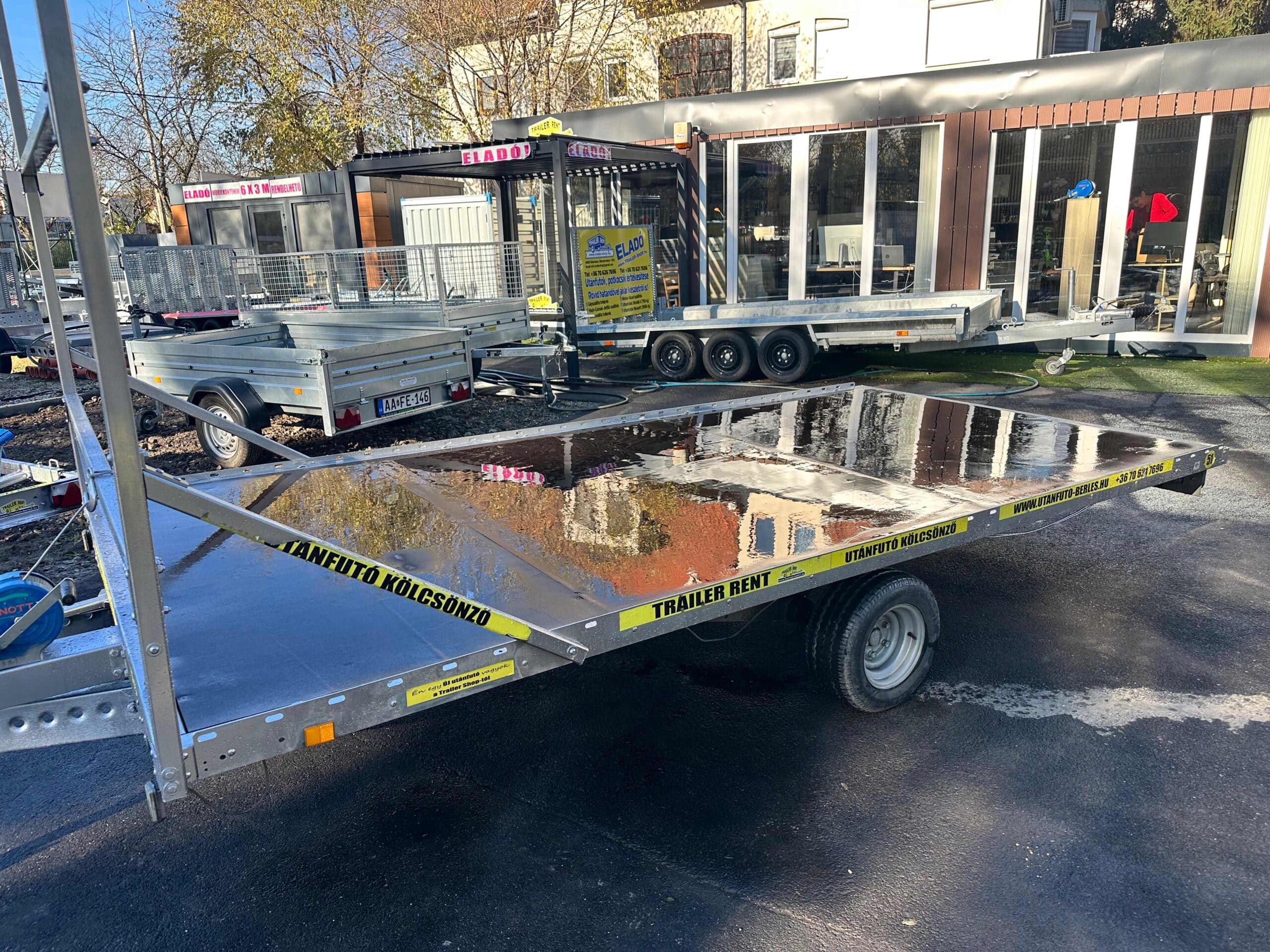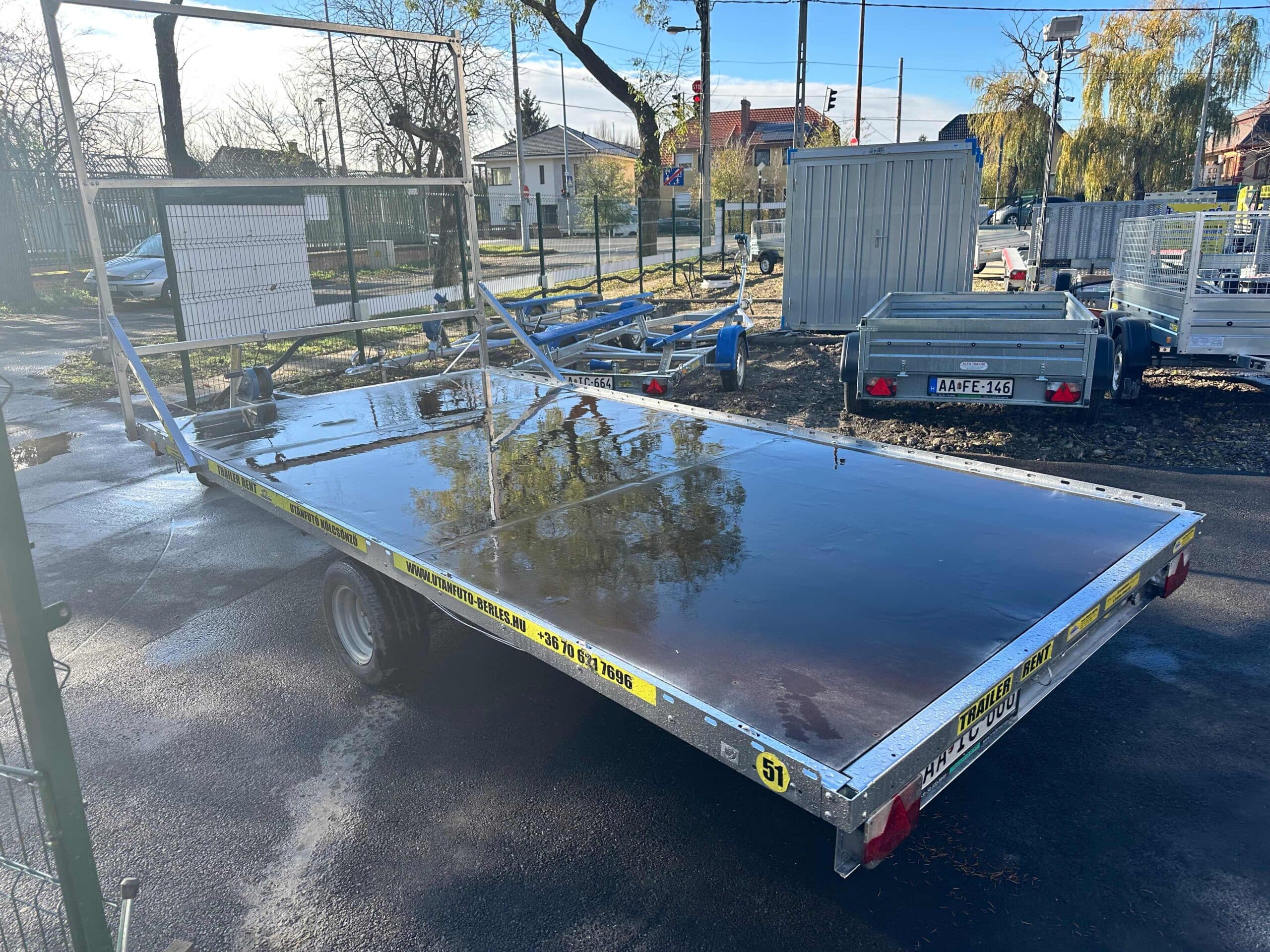 ALFA 24020AP.75 10″ 4,05×2,00m méretű, 1300kg egytengelyes fékezett alsókerekes uniplatós síkplatós utánfutó trailer, tréler, használt utánfutó