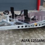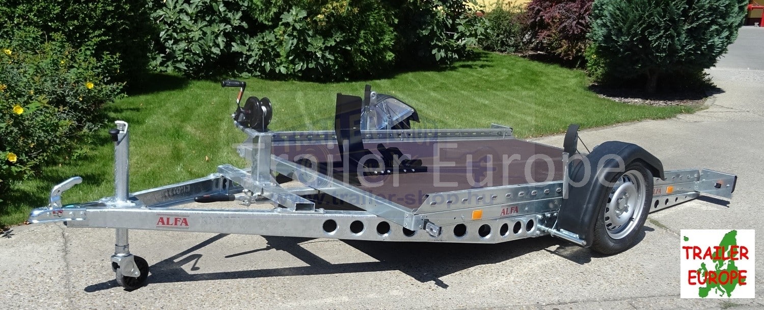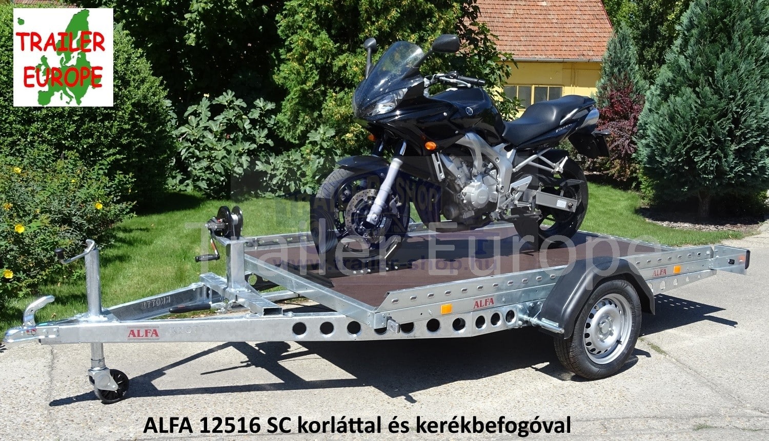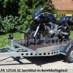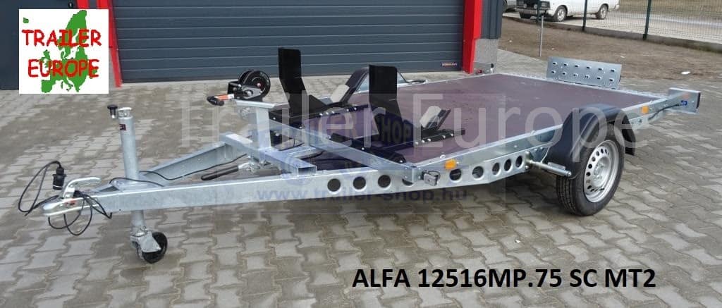 ALFA-B 23016MP.130SC egytengelyes 3,0×1,6m méretű, 1300kg, fékezett mellsőkerekes uniplatós síkplatós süllyeszthető motorszállító és quadszállító utánfutó