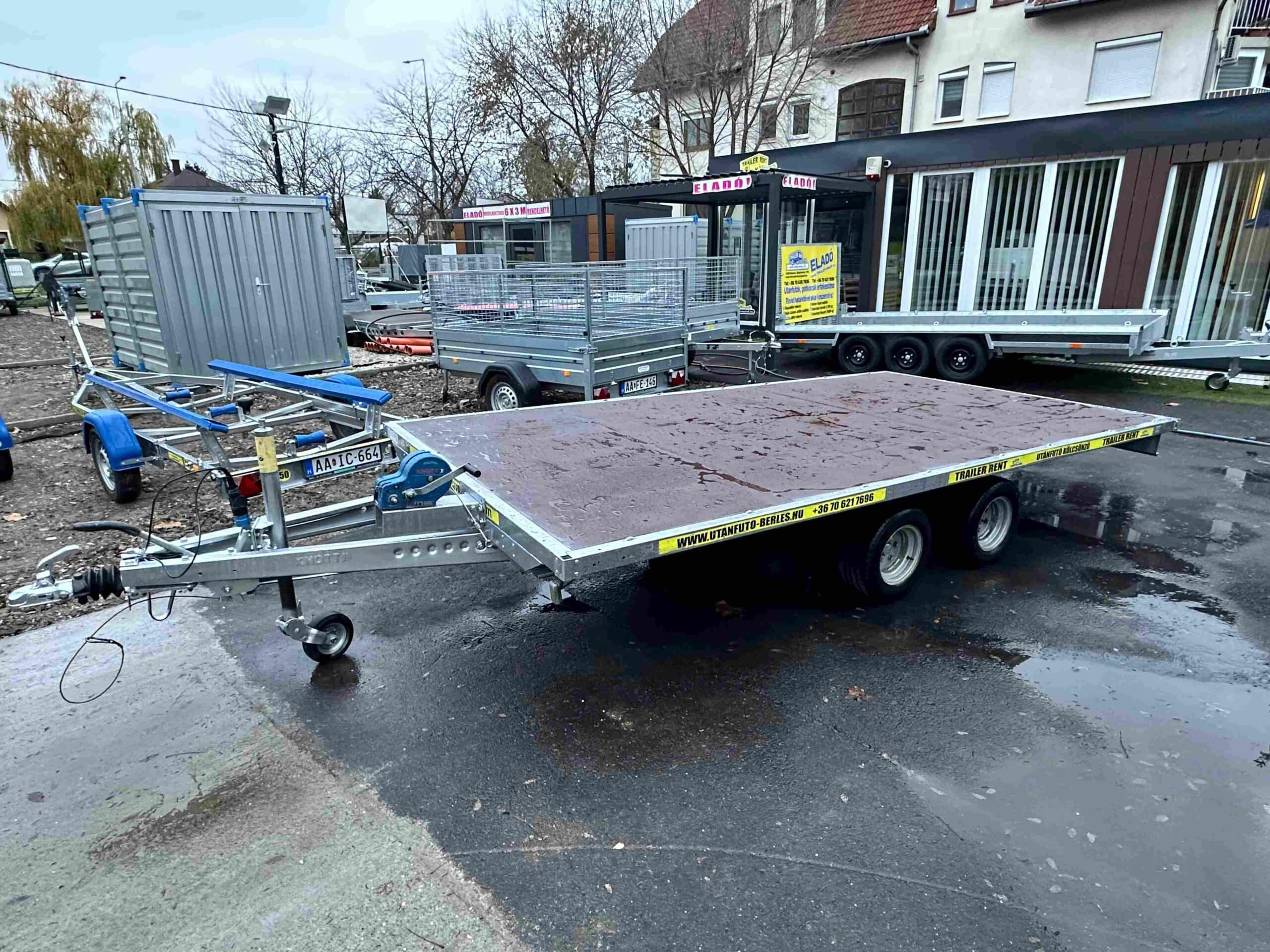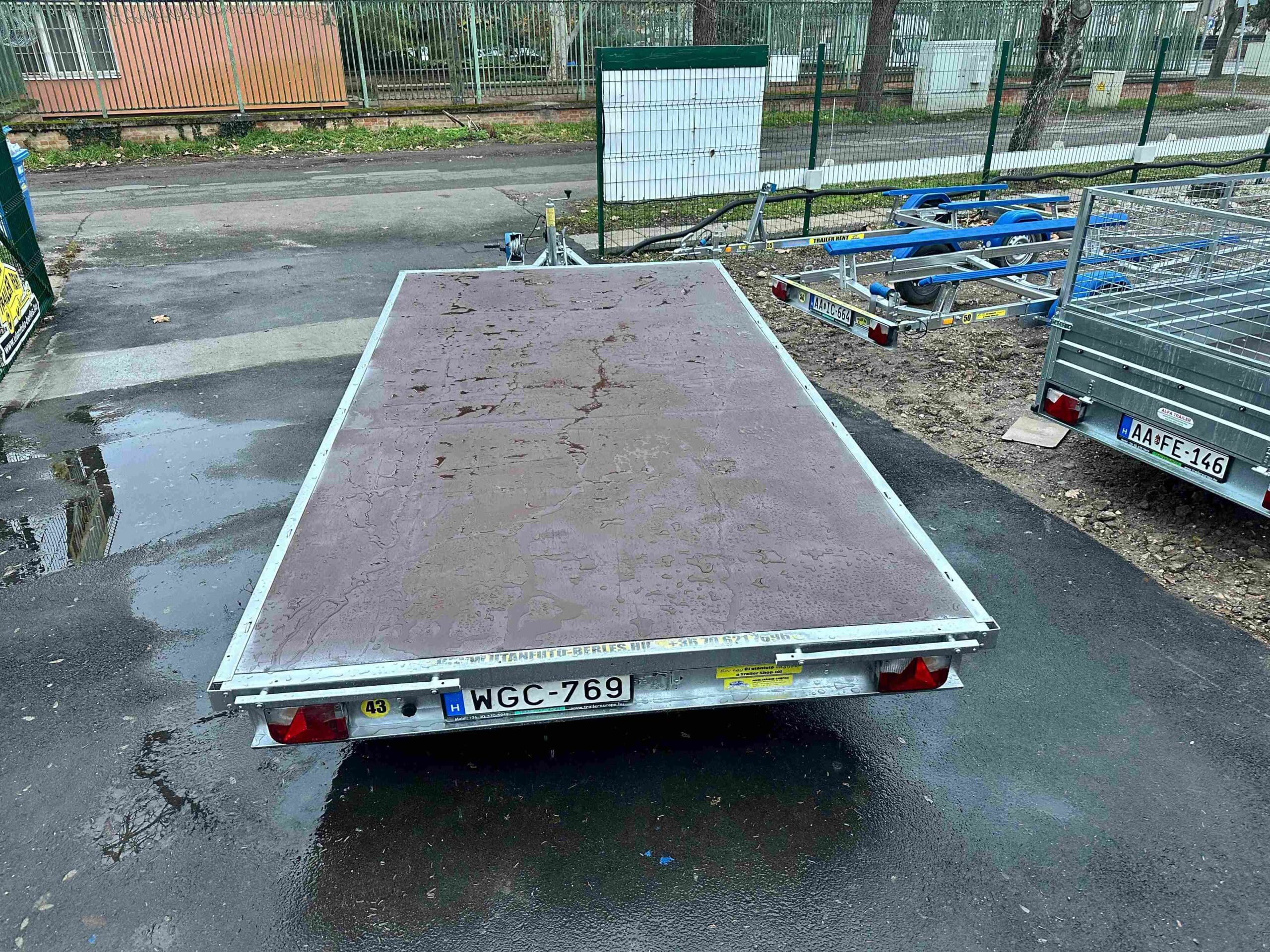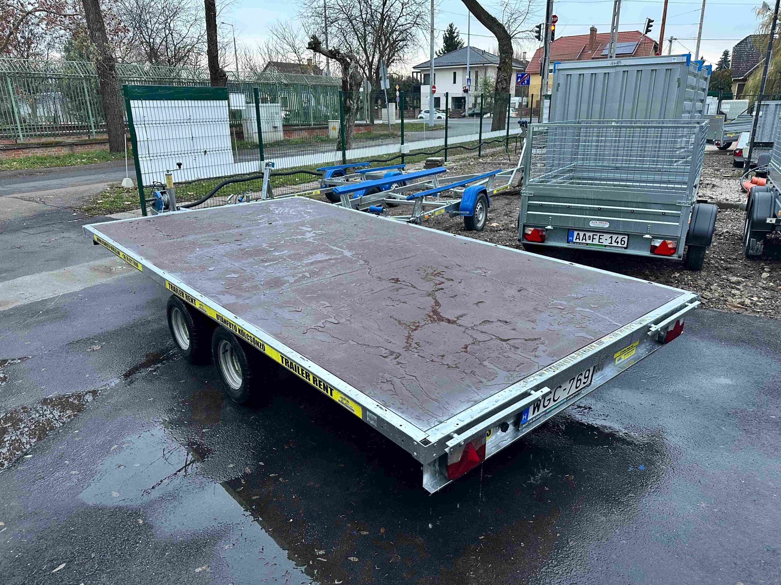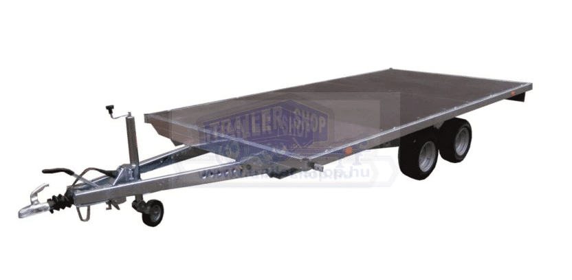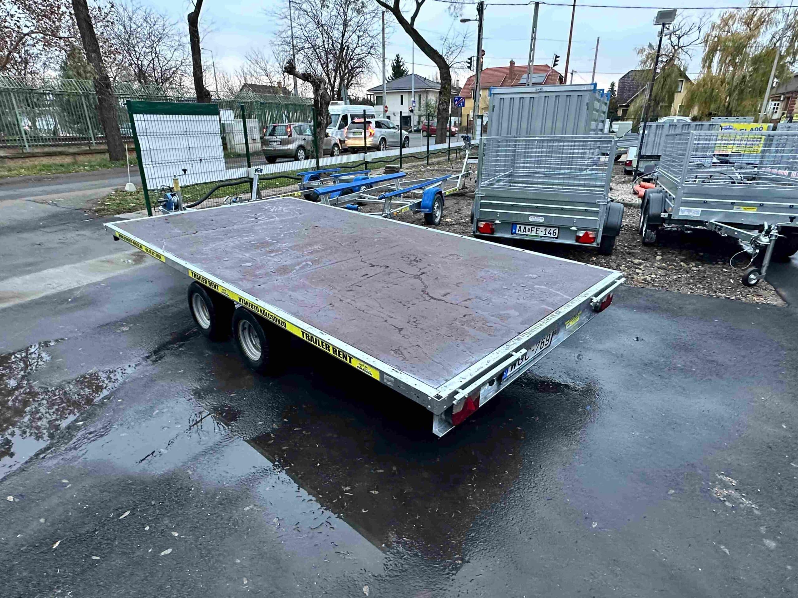 ALFA-T 44020AP.270-ig 10″ kéttengelyes, 4,05×2,0m, 2700kg, fékezett, alsókerekes, síkplatós, uniplatós utánfutó, trailer, tréler és autószállító tréler, használt utánfutó
