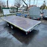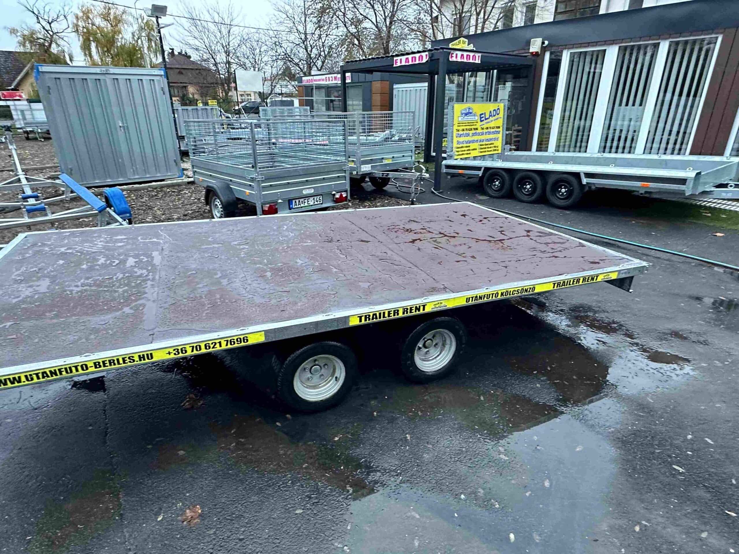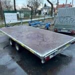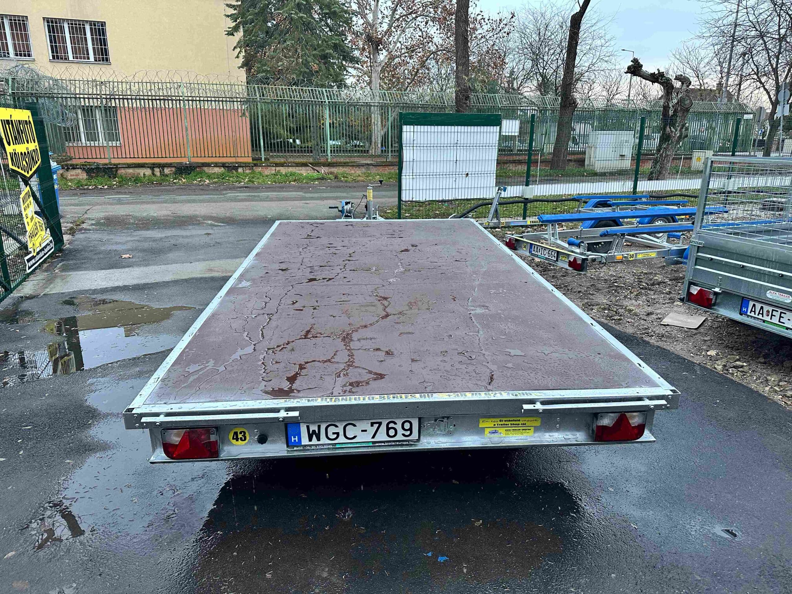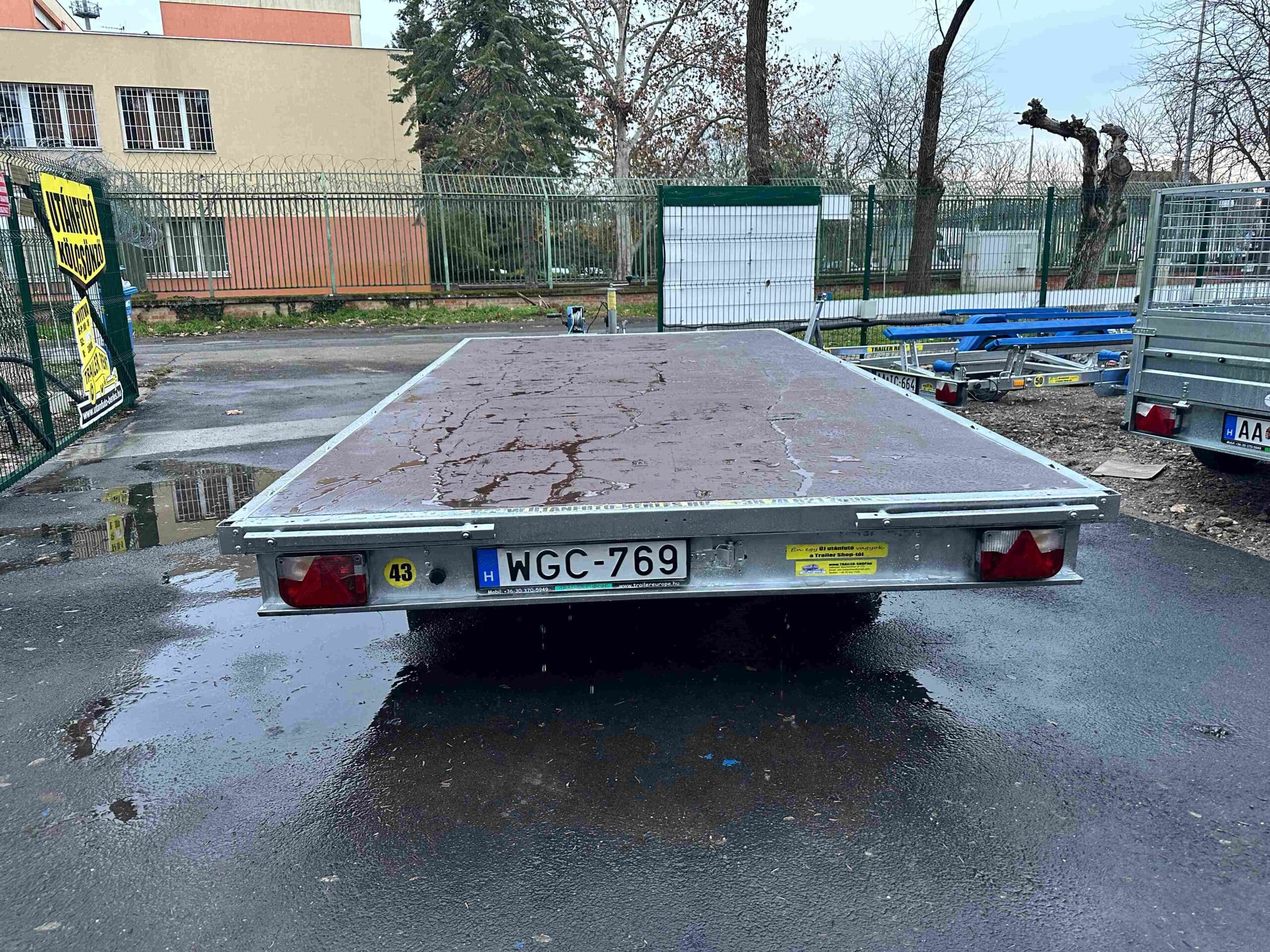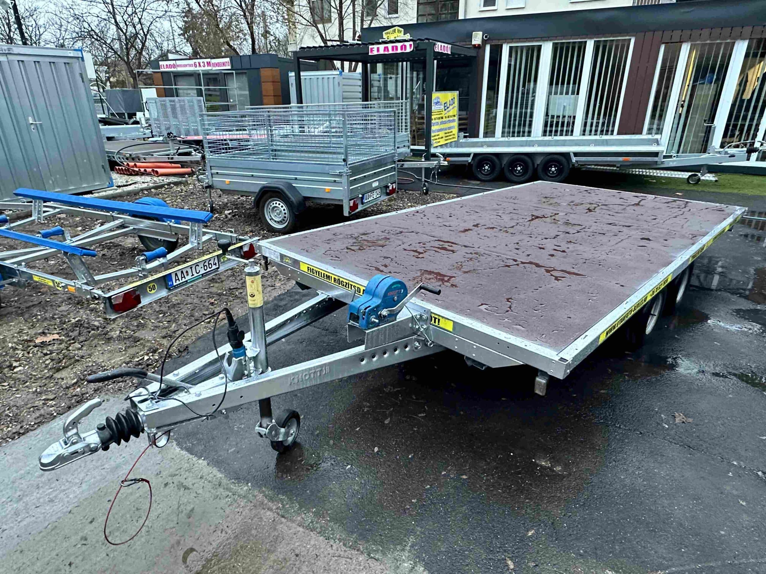 ALFA-T 44020AP.270-ig 10″ kéttengelyes, 4,05×2,0m, 2700kg, fékezett, alsókerekes, síkplatós, uniplatós utánfutó, trailer, tréler és autószállító tréler, használt utánfutó