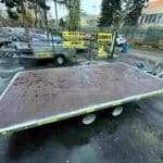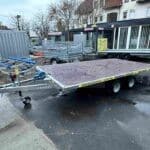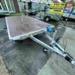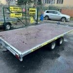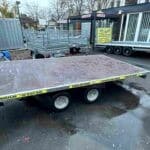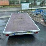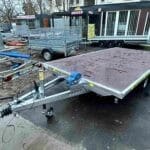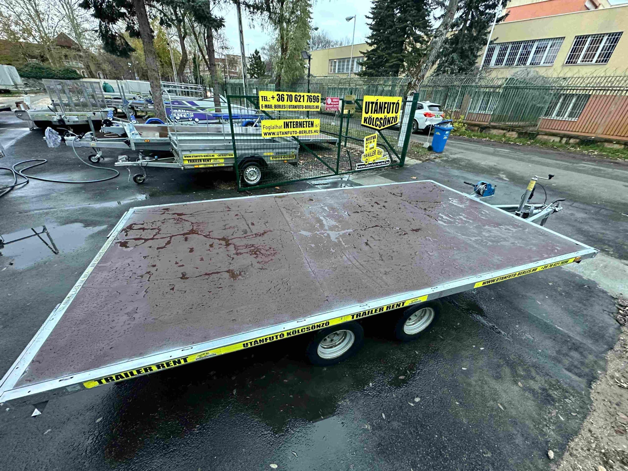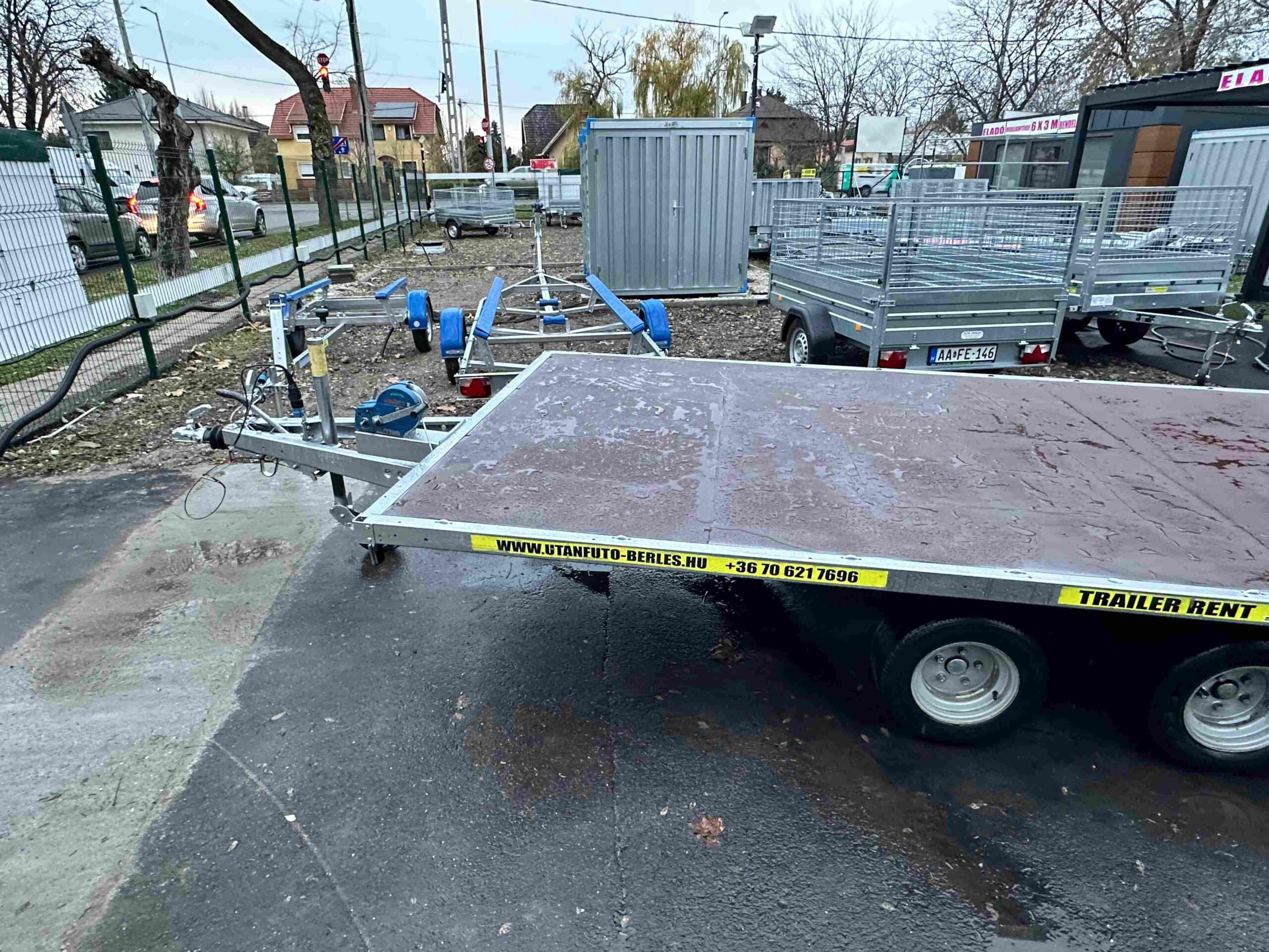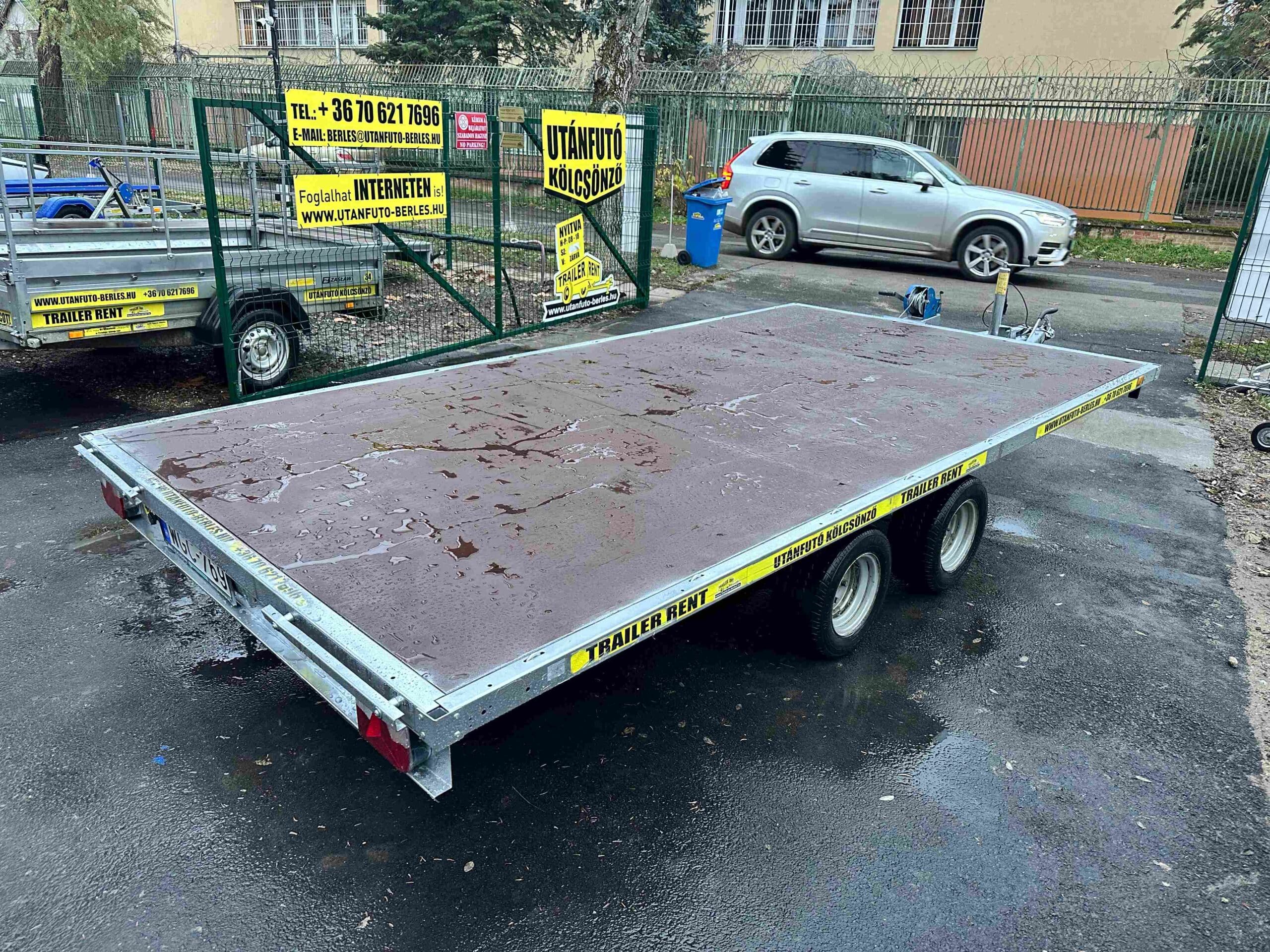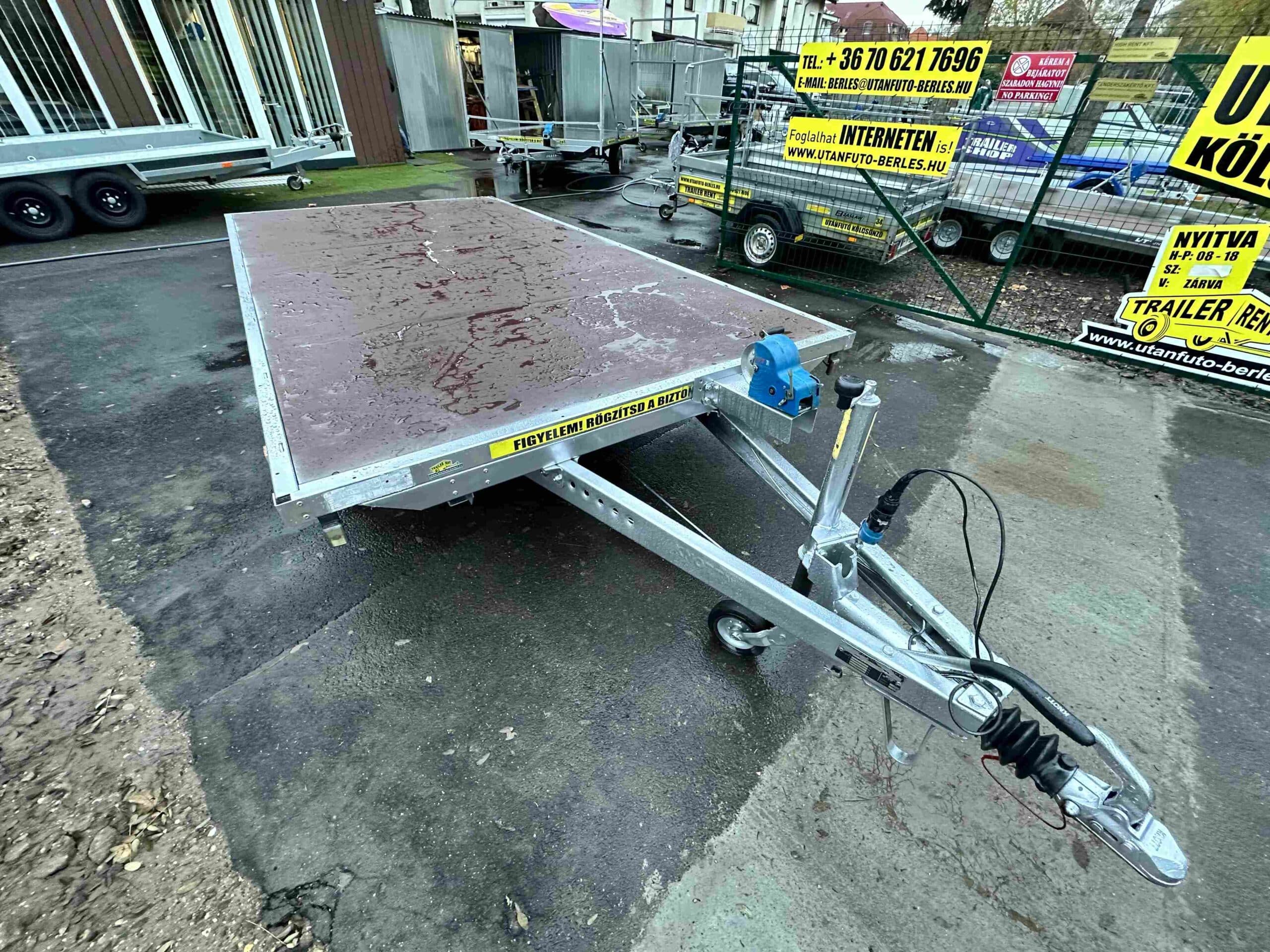ALFA-T 44020AP.270-ig 10″ kéttengelyes, 4,05×2,0m, 2700kg, fékezett, alsókerekes, síkplatós, uniplatós utánfutó, trailer, tréler és autószállító tréler, használt utánfutó