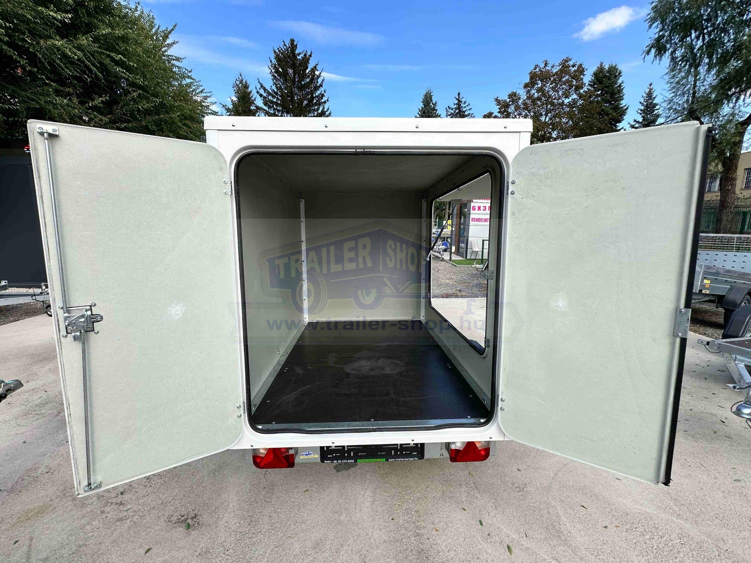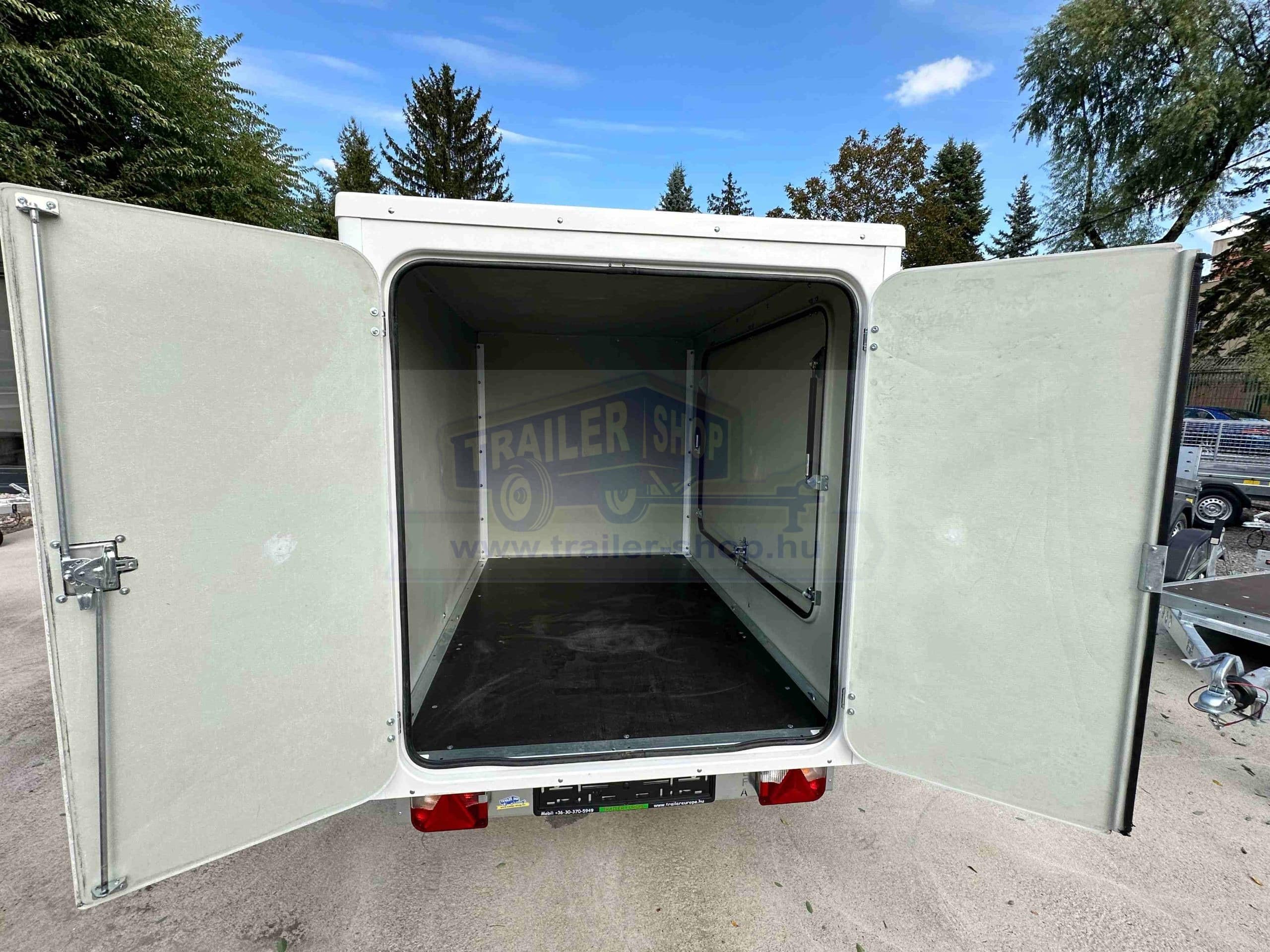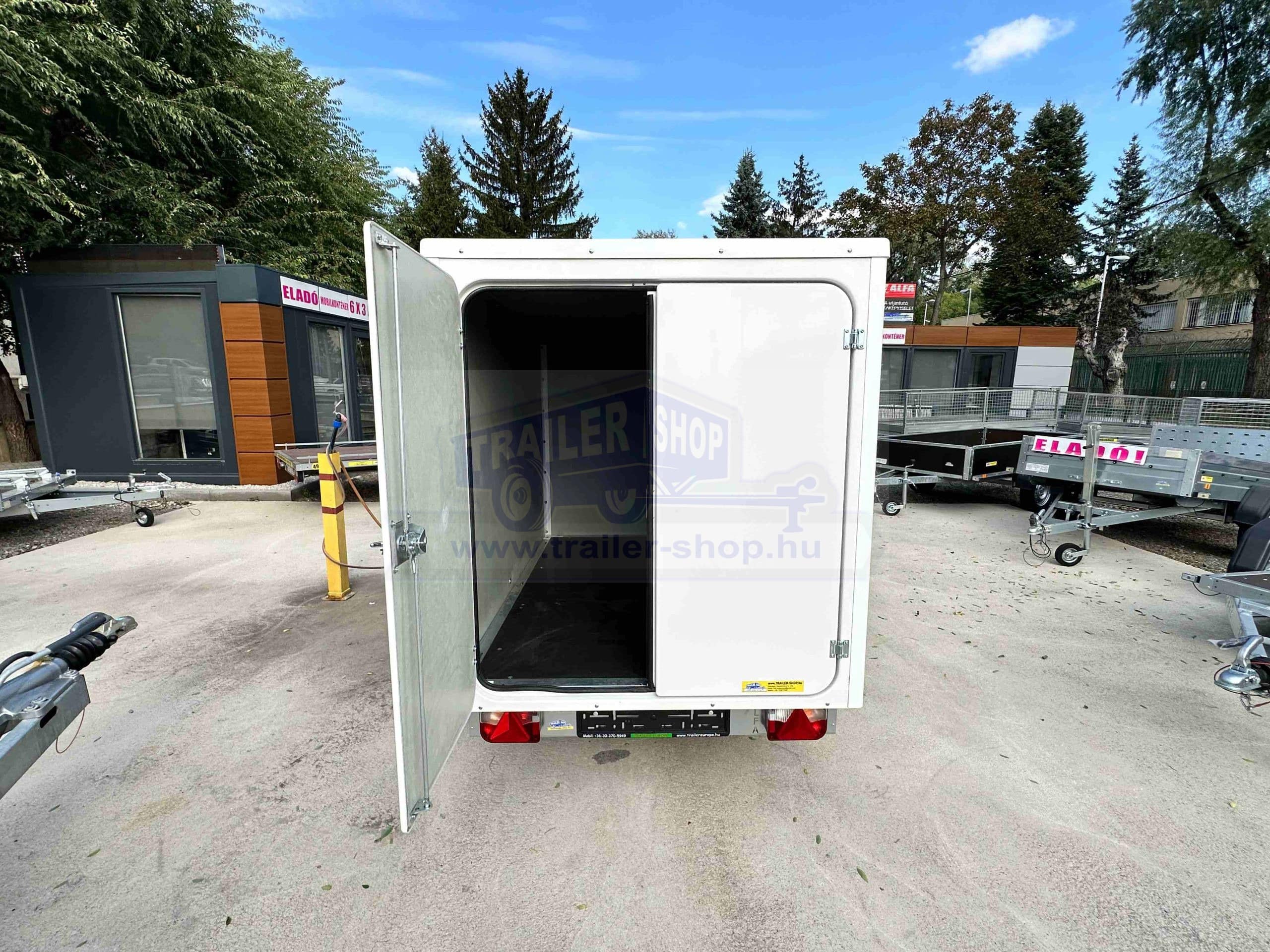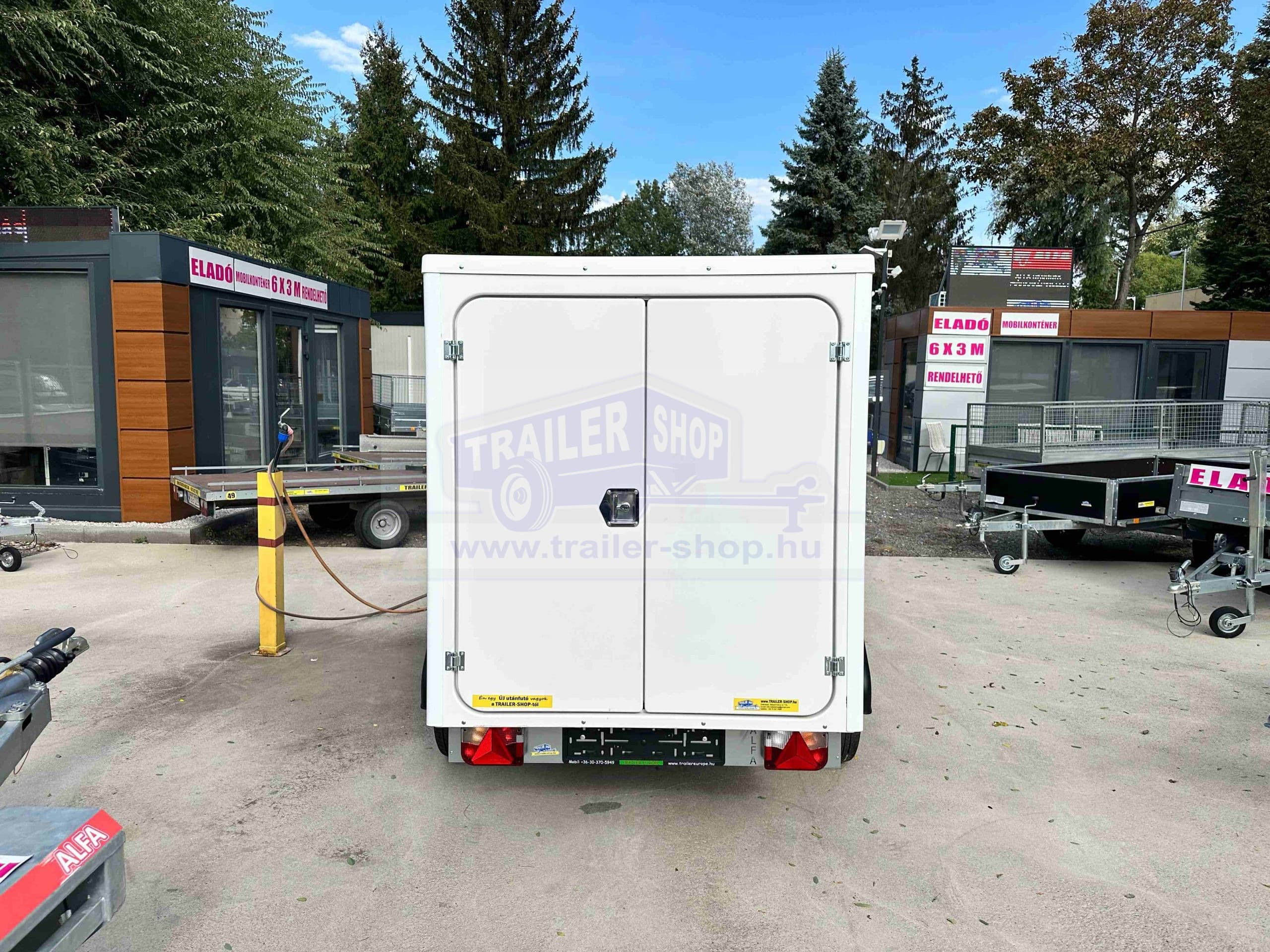 ALFA-T Modulo 42516MPK.200.2 dobozos kéttengelyes H:2,52 x Sz:1,56 x M:1,4m méretű, 2000kg, fékezett zárt utánfutó, 2 hátsó ajtóval, 1 oldal ajtóval, 1 fix oldalfallal
