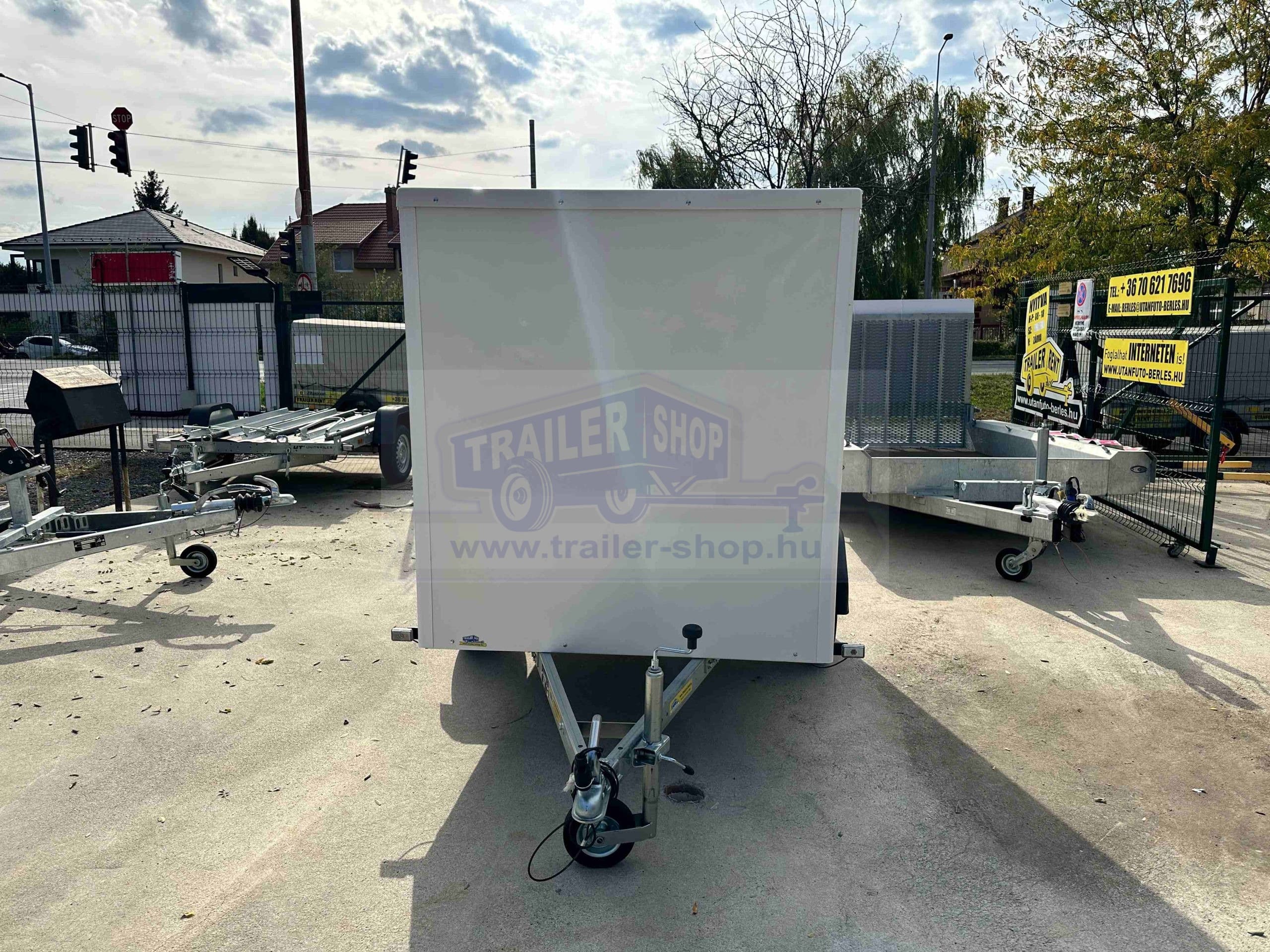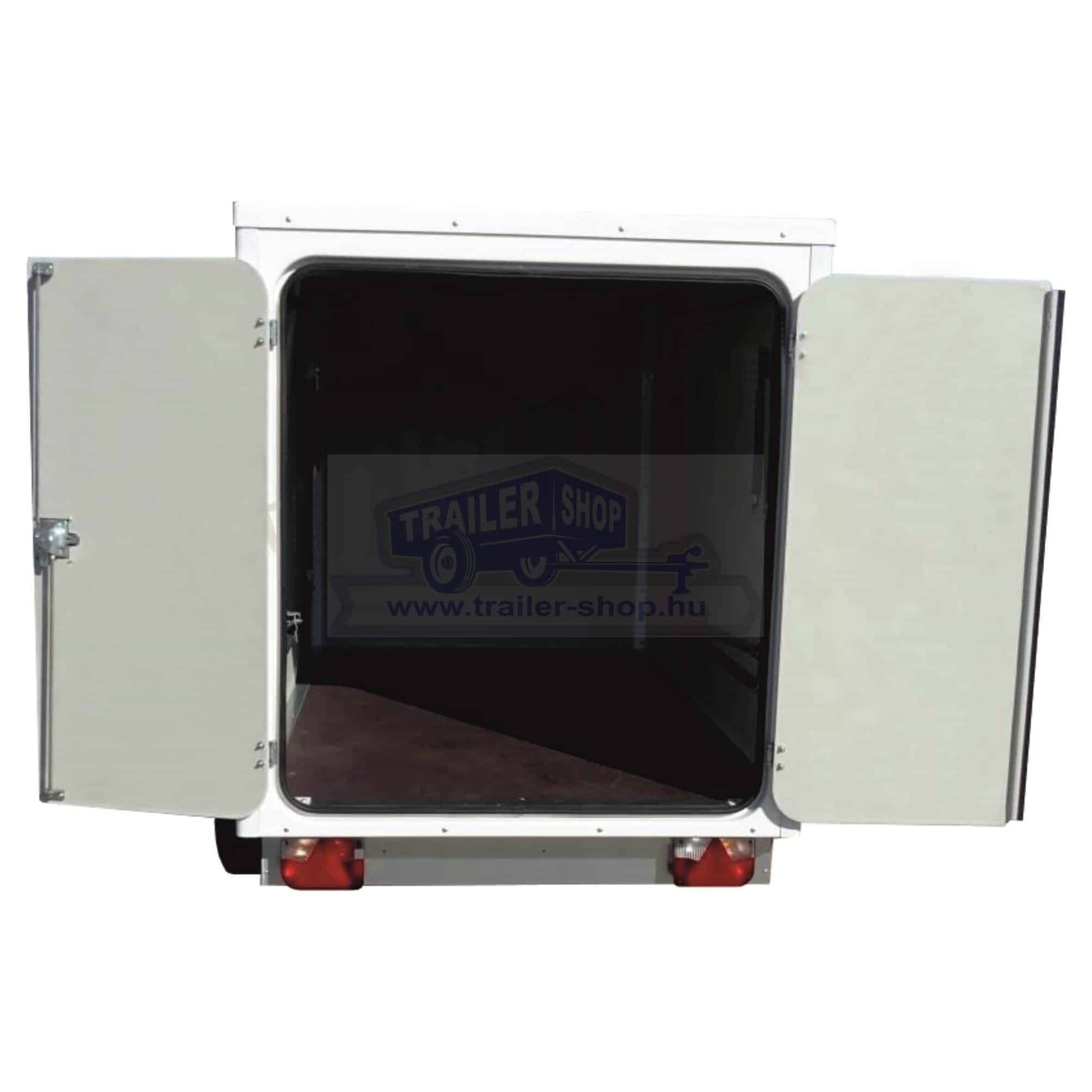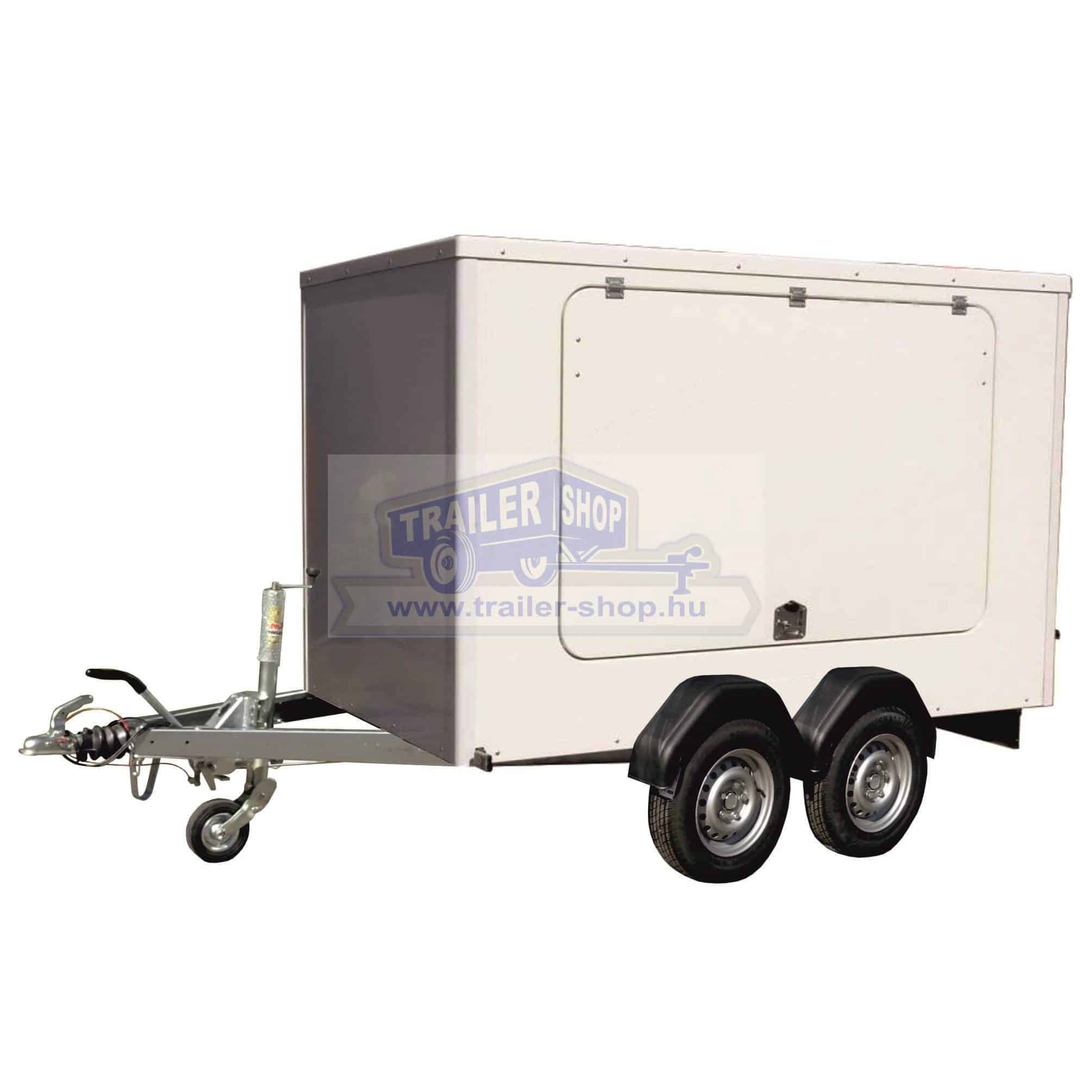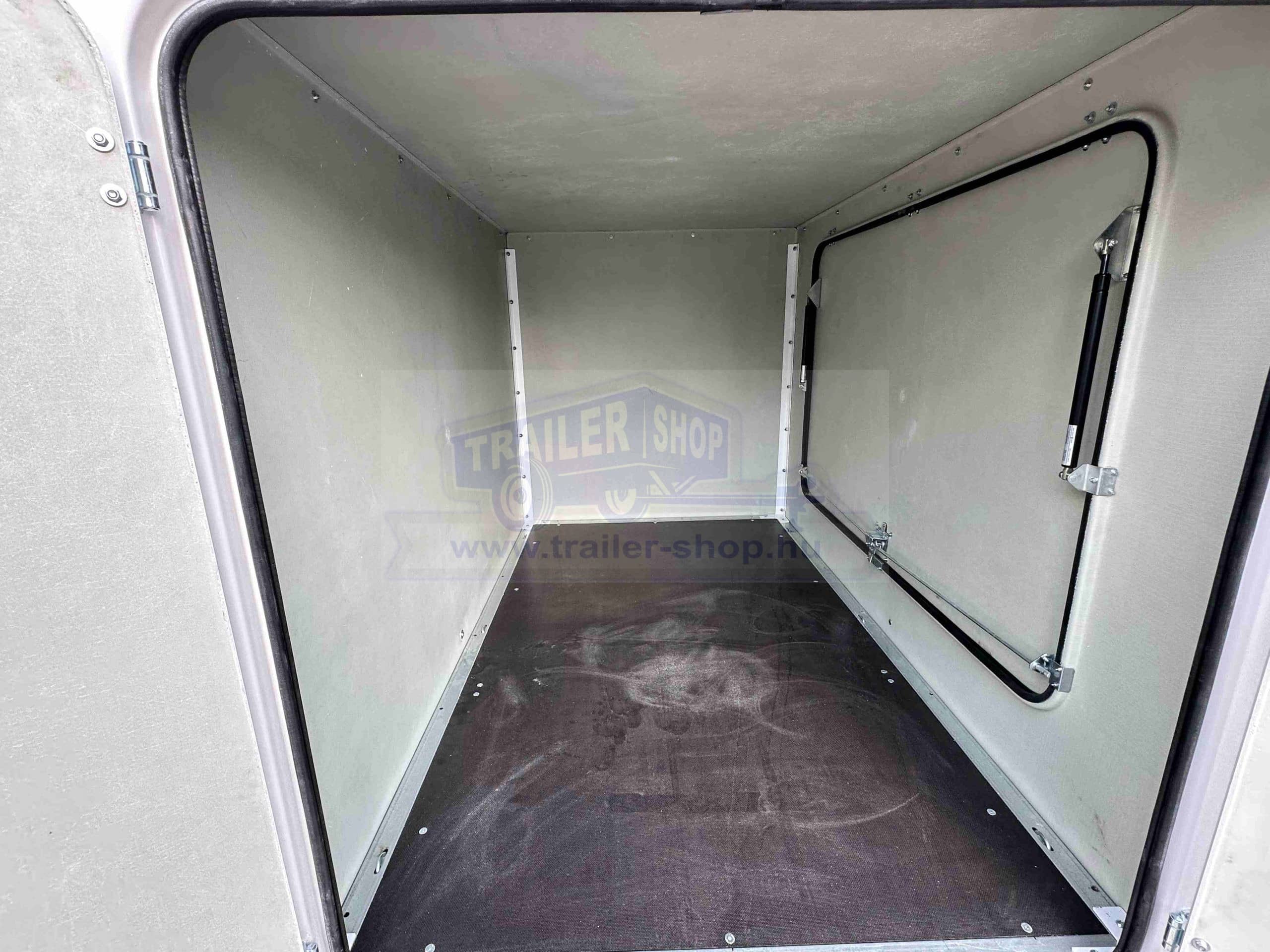 ALFA-T Modulo 42516MPK.200.2 dobozos kéttengelyes H:2,52 x Sz:1,56 x M:1,4m méretű, 2000kg, fékezett zárt utánfutó, 2 hátsó ajtóval, 1 oldal ajtóval, 1 fix oldalfallal