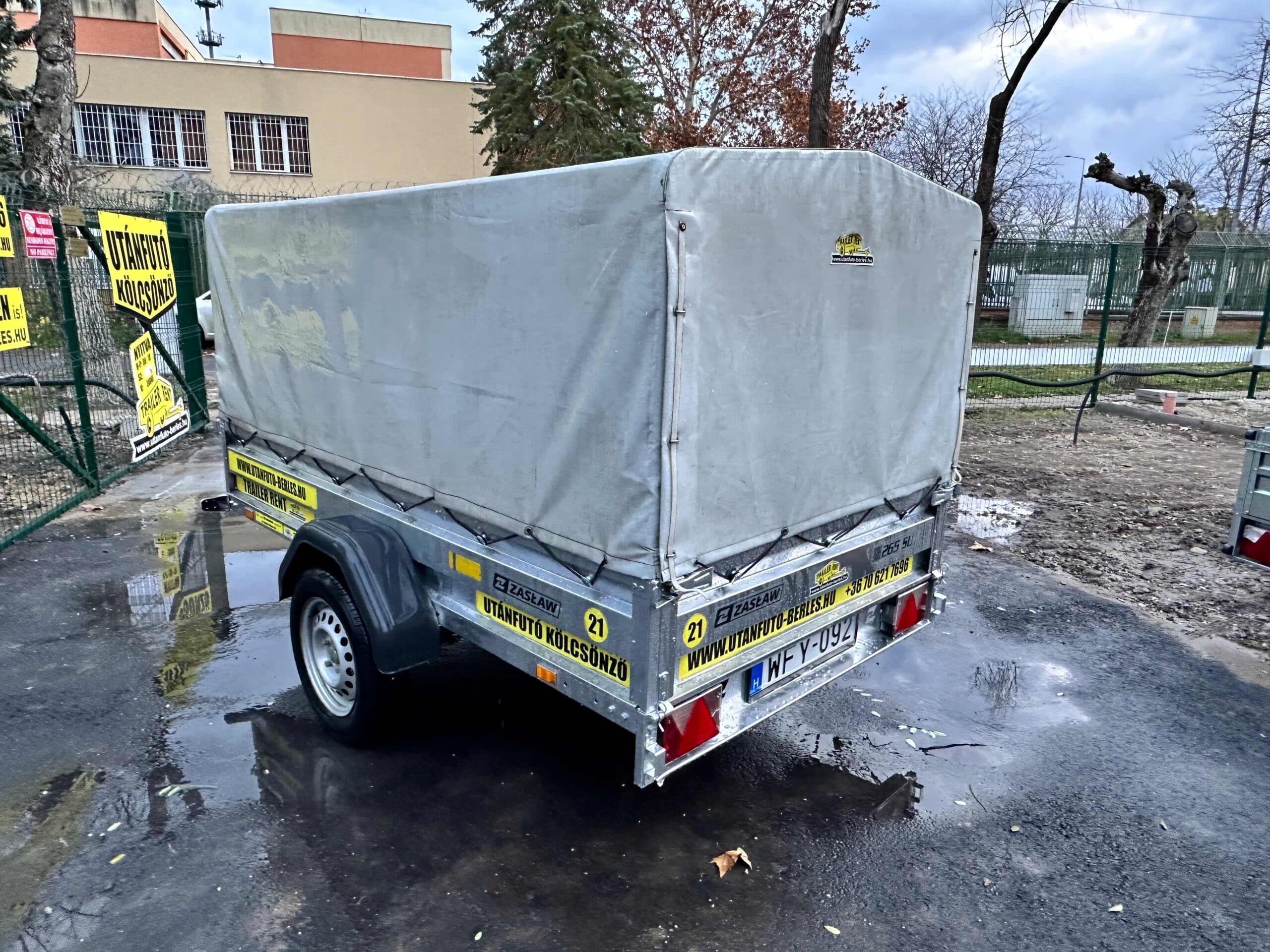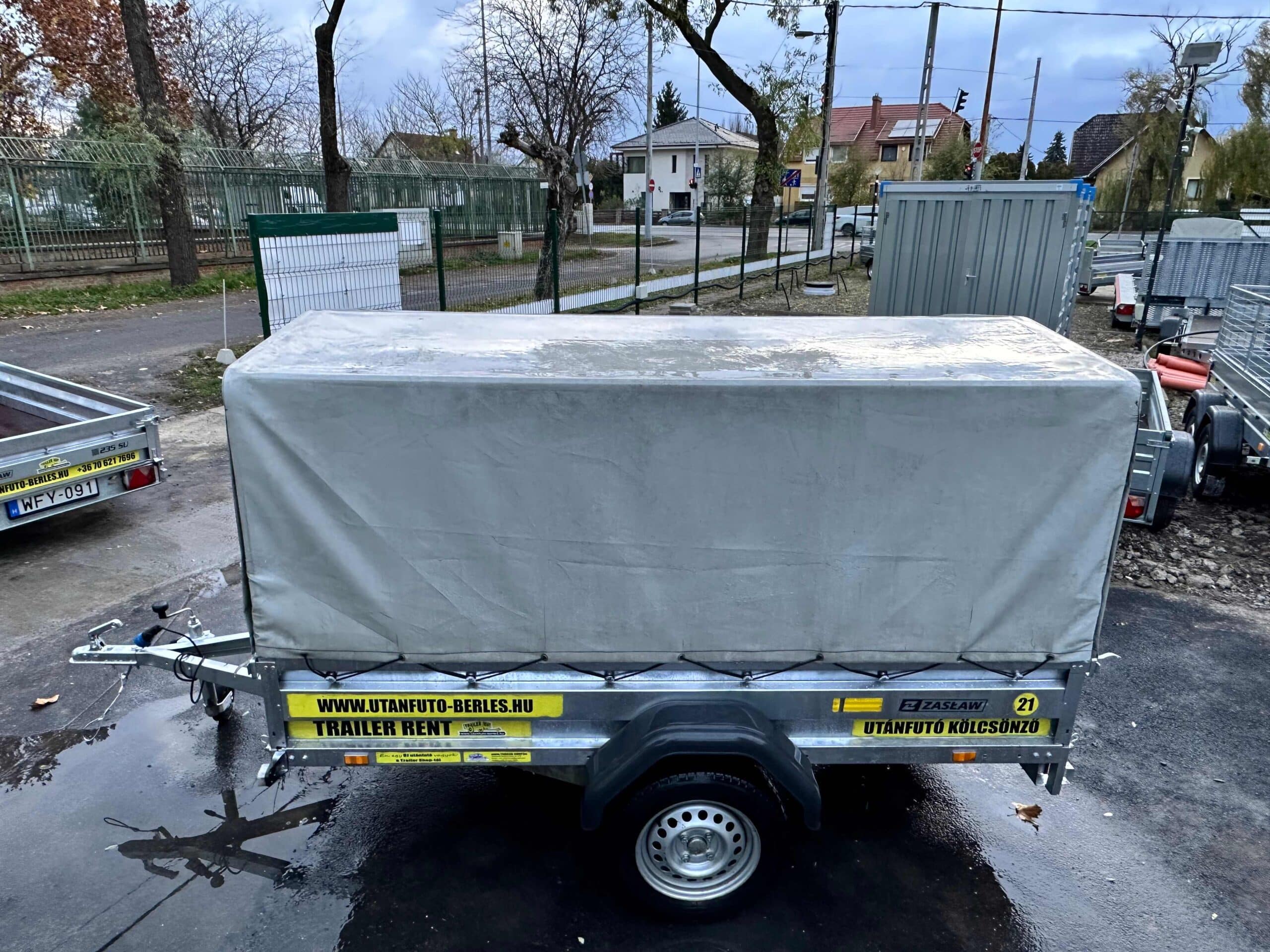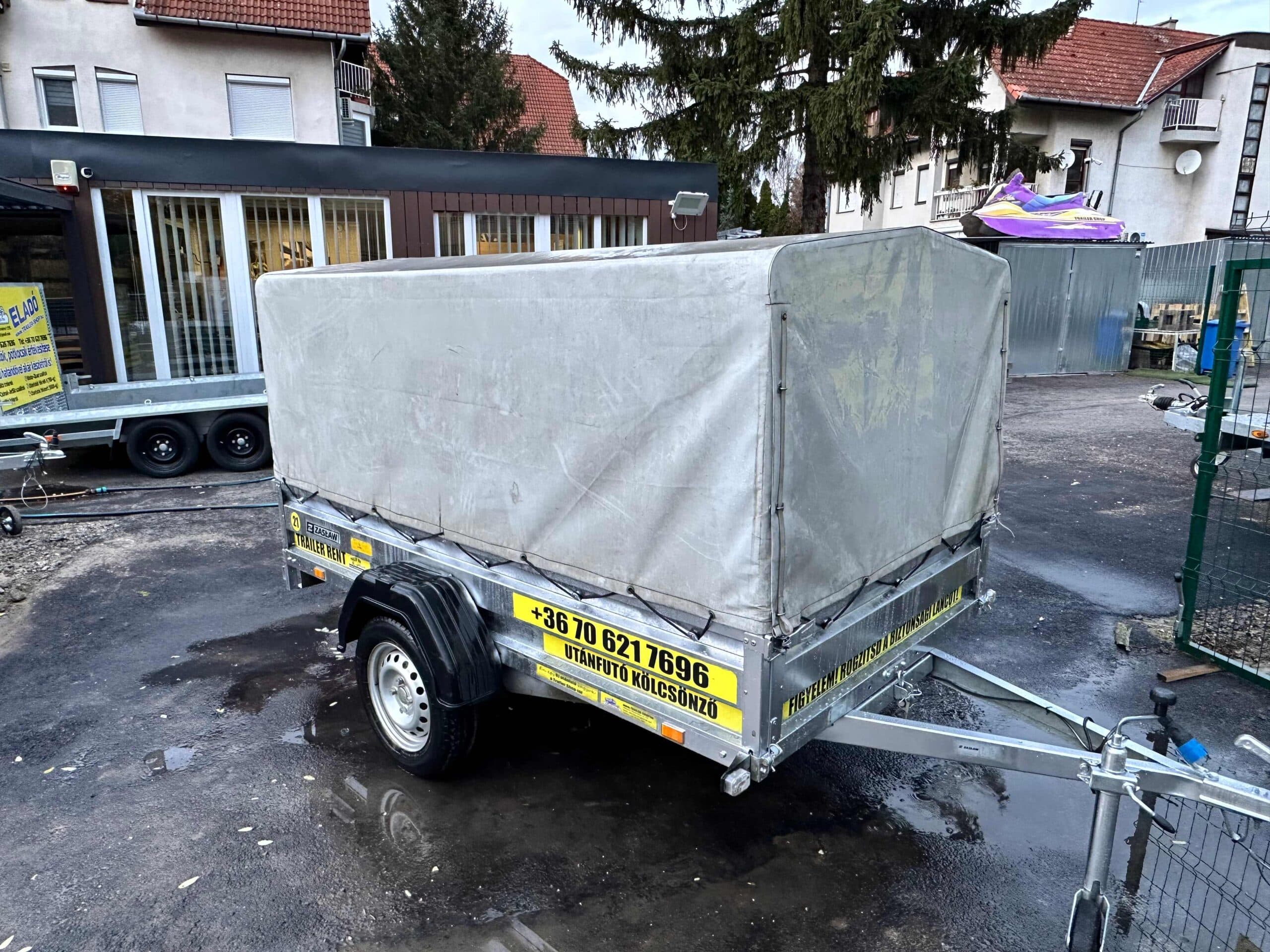 Zaslaw 235SU 2,35×1,32m méretű, 750kg fékezetlen mellsőkerekes ponyvás utánfutó, használt utánfutó