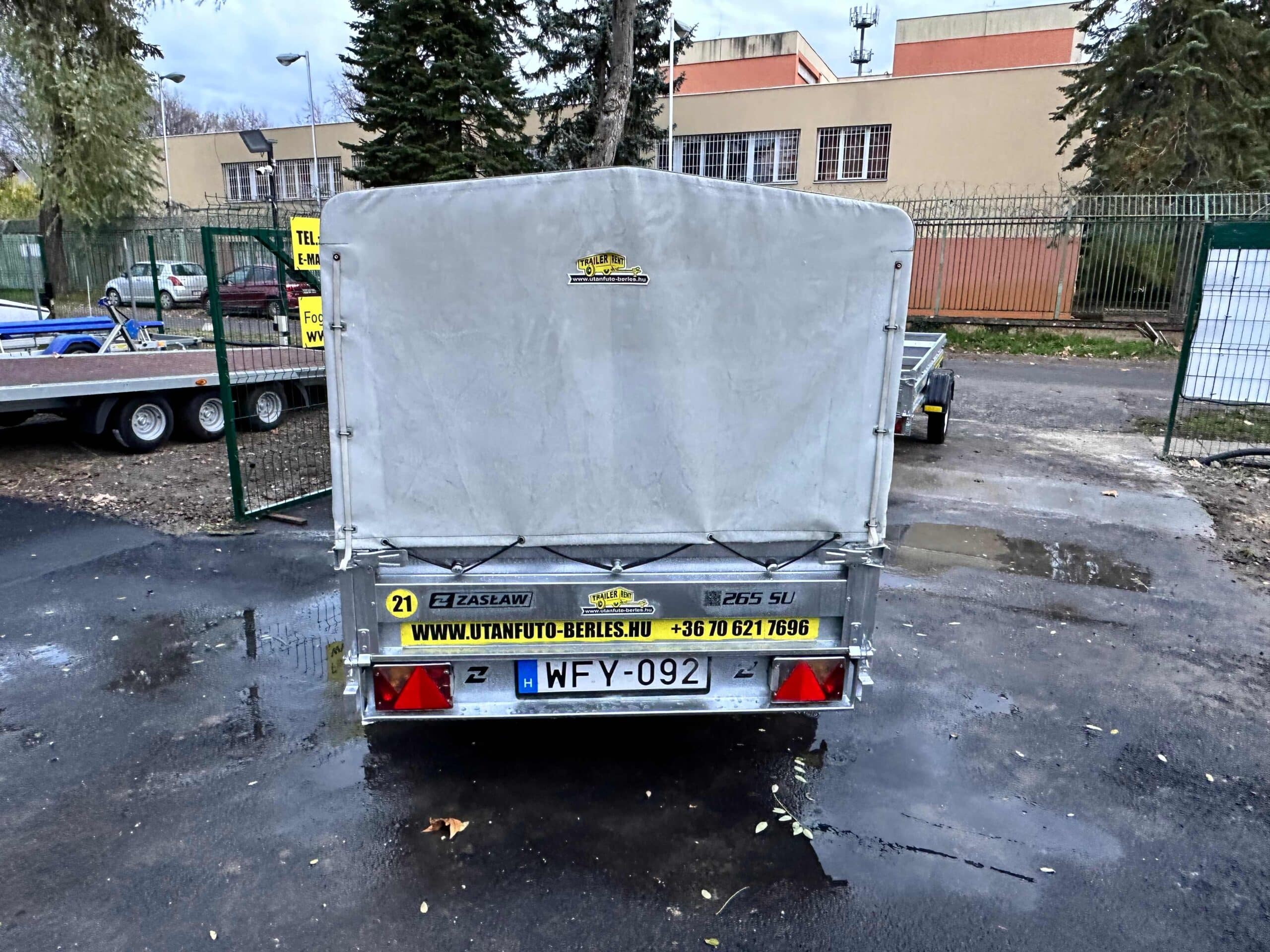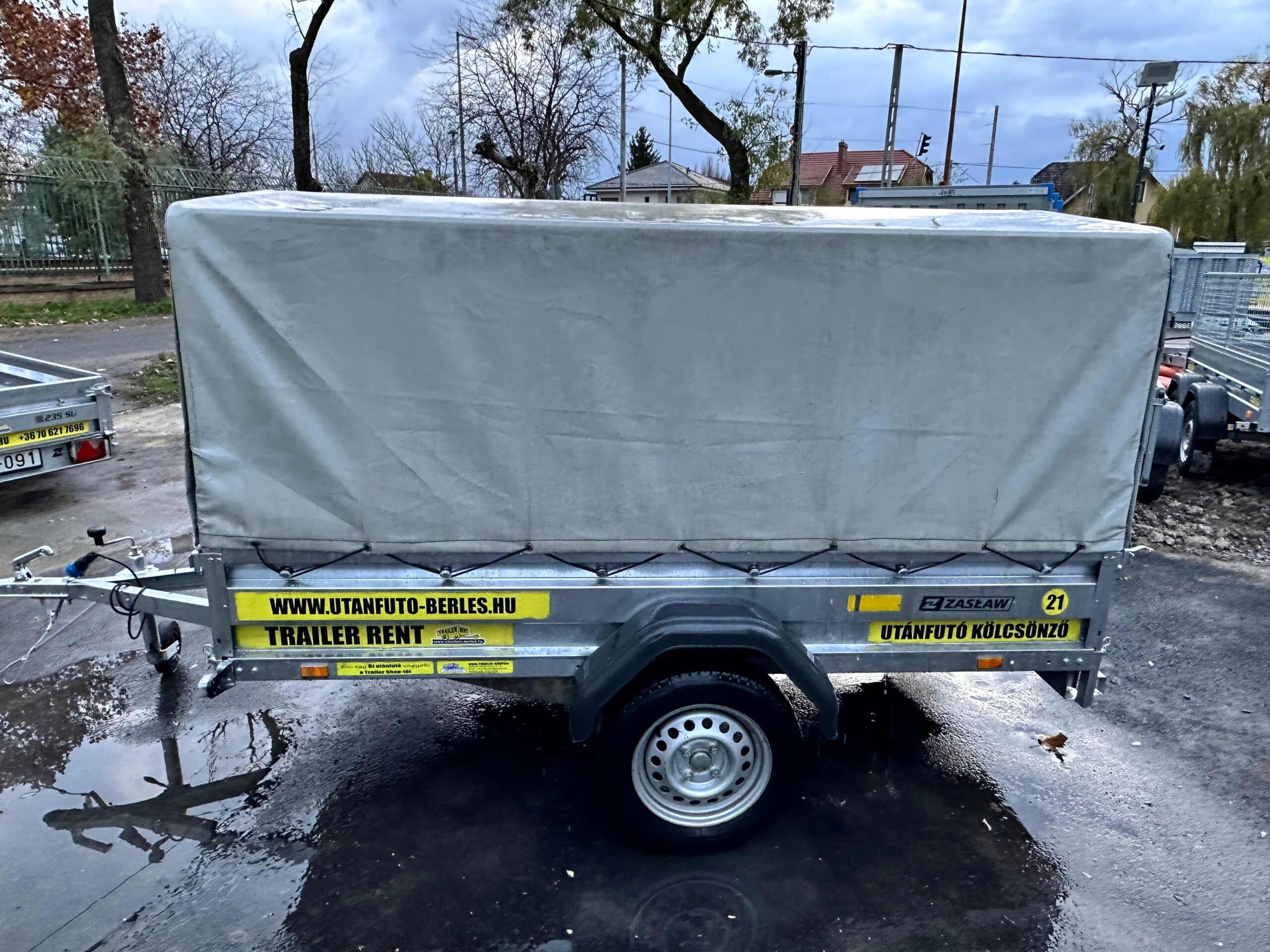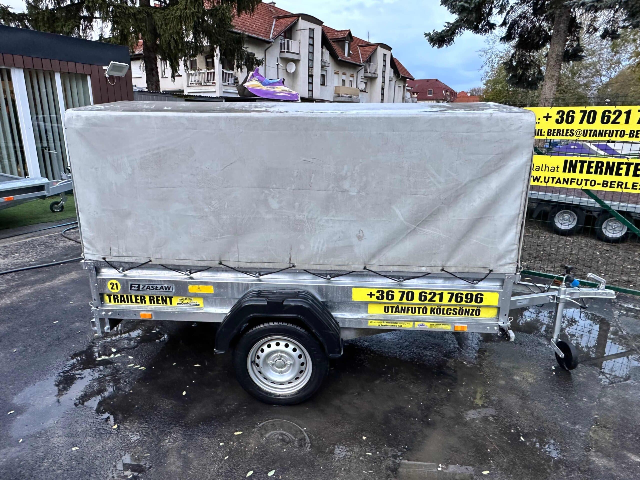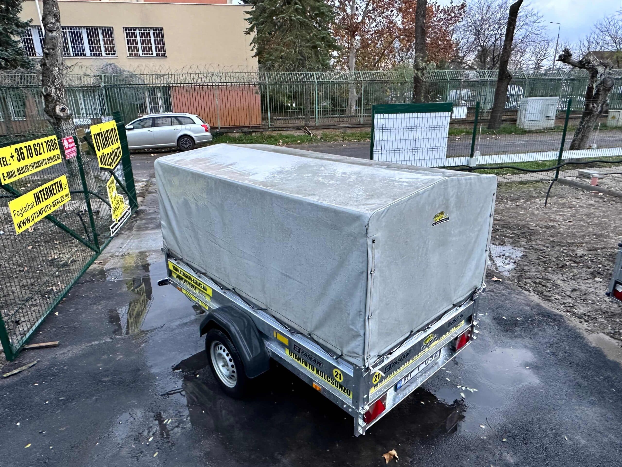 Zaslaw 235SU 2,35×1,32m méretű, 750kg fékezetlen mellsőkerekes ponyvás utánfutó, használt utánfutó