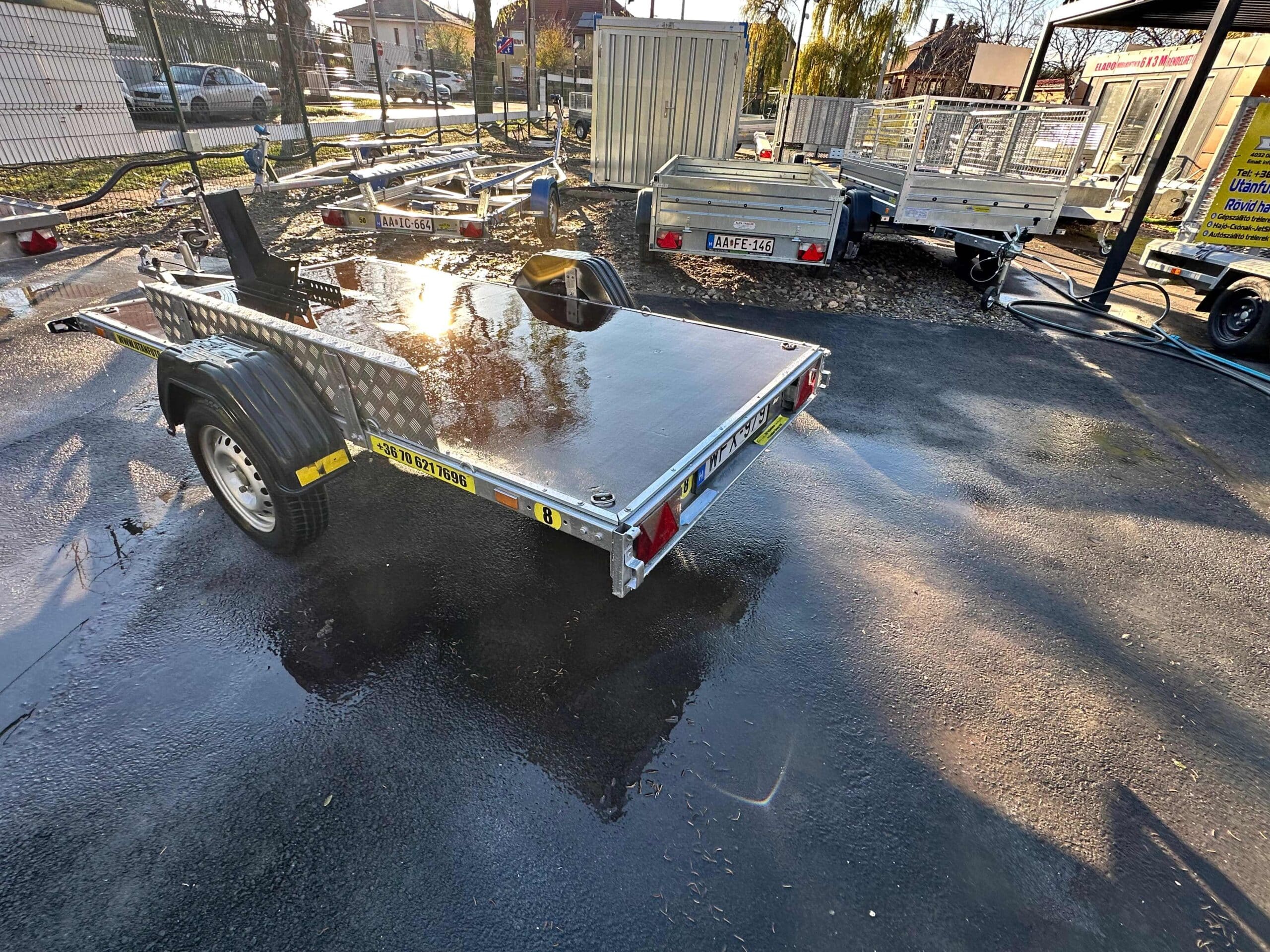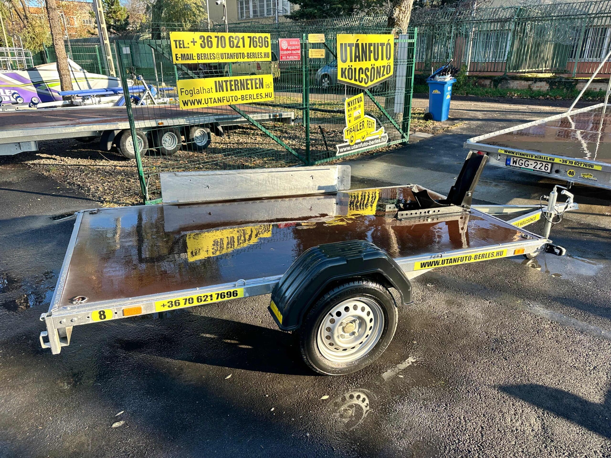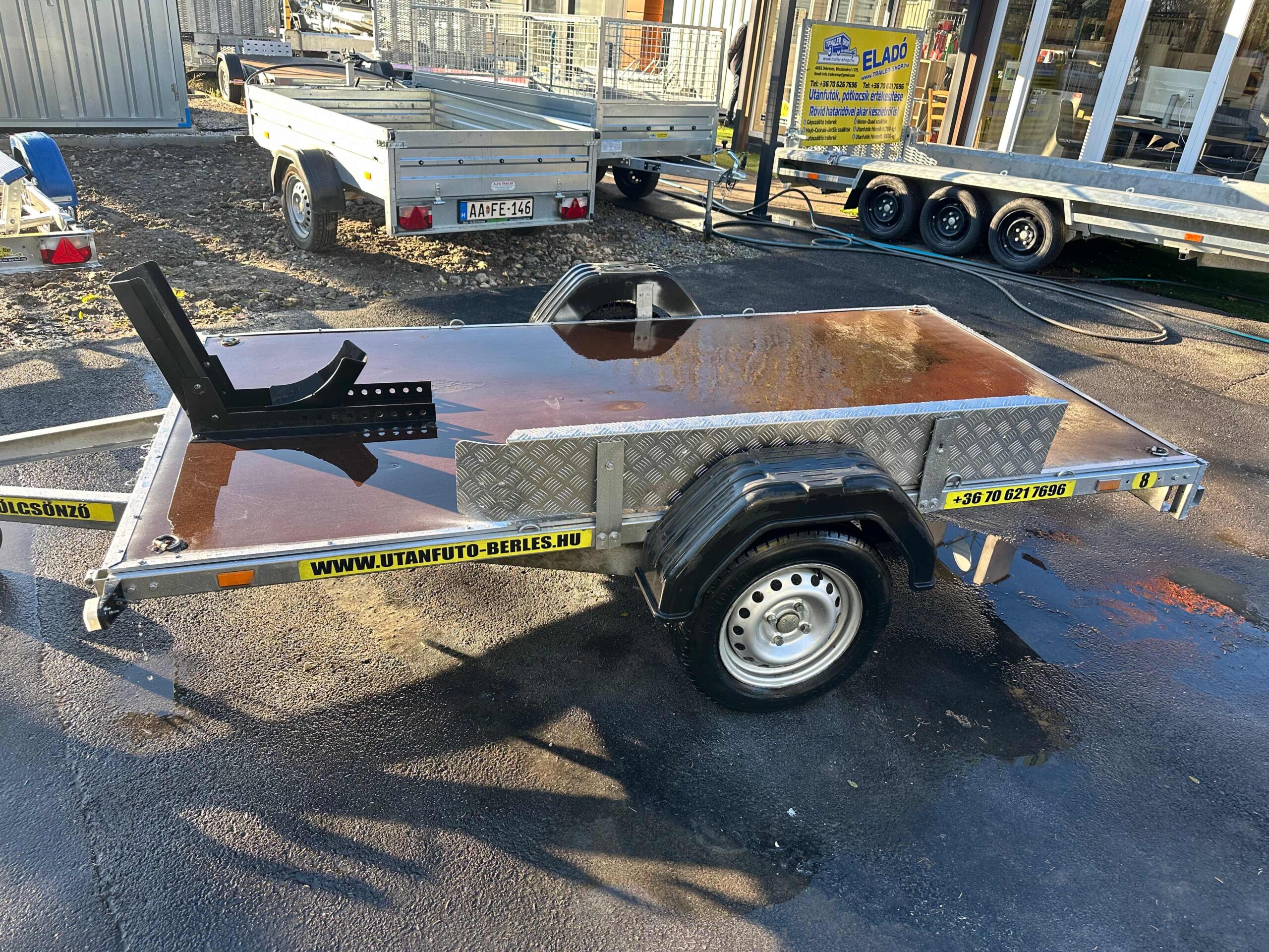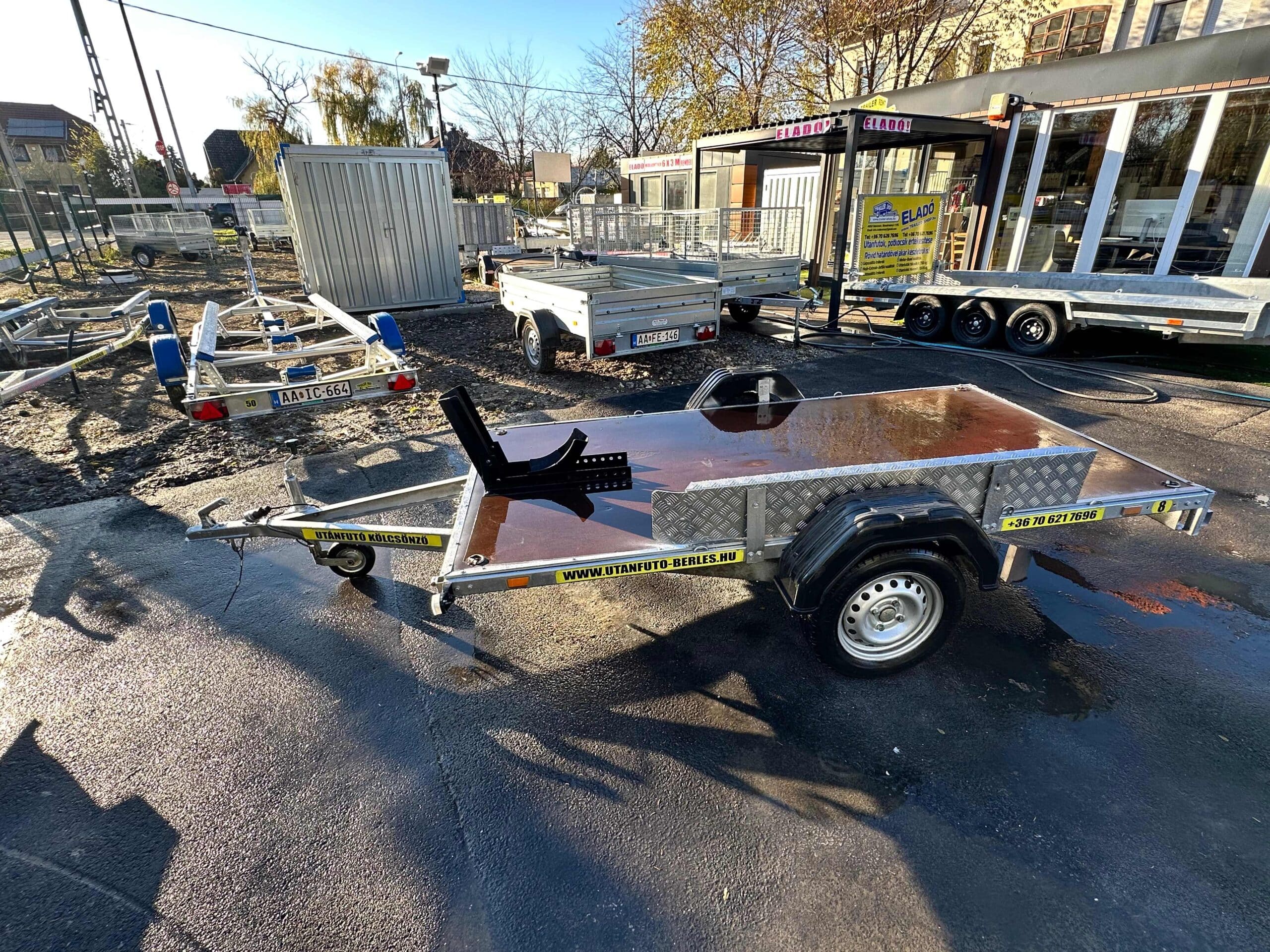 Horganyzott acéllemez alvázelemek és oldalfalak, rétegelt lemez fa padozat. 13 colos kerekek, 7 pólusú elektromos csatlakozó, 4db rakományrögzítő fül. Az utánfutóhoz tartozékként szerelt rámpa, motorbefogó és támasztókerék is az ár részét képezik. 2021-es gyártású utánfutó. Műszaki érvényesség: 2027.10.18.